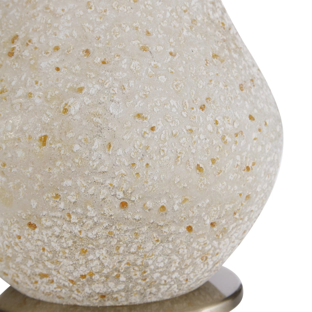 This Table Lamp Features A Heavily Textured Art Glass Base In Shades Of Cream, Ivory, And Rust Brown, Accented With Brushed Antique Brass Plated Details. The Hardback Drum Shade Is A White Linen Fabric.