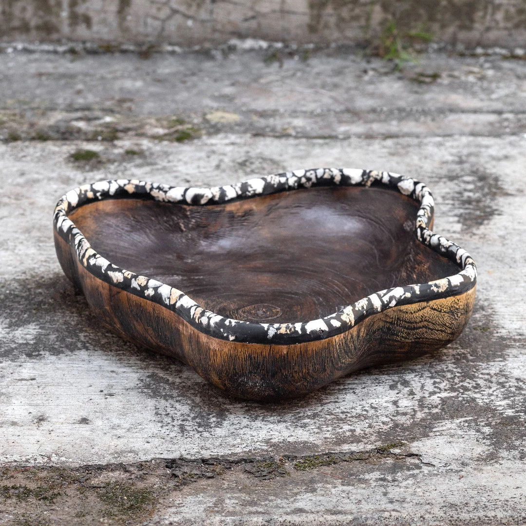 Made Of Natural Teak Wood With A Charcoal Wash, Each Piece Is Handcrafted Making It Unique. Black And White Rim Details Add A Bohemian Element To The Design. Cracks And Variations In The Grain Are Normal.