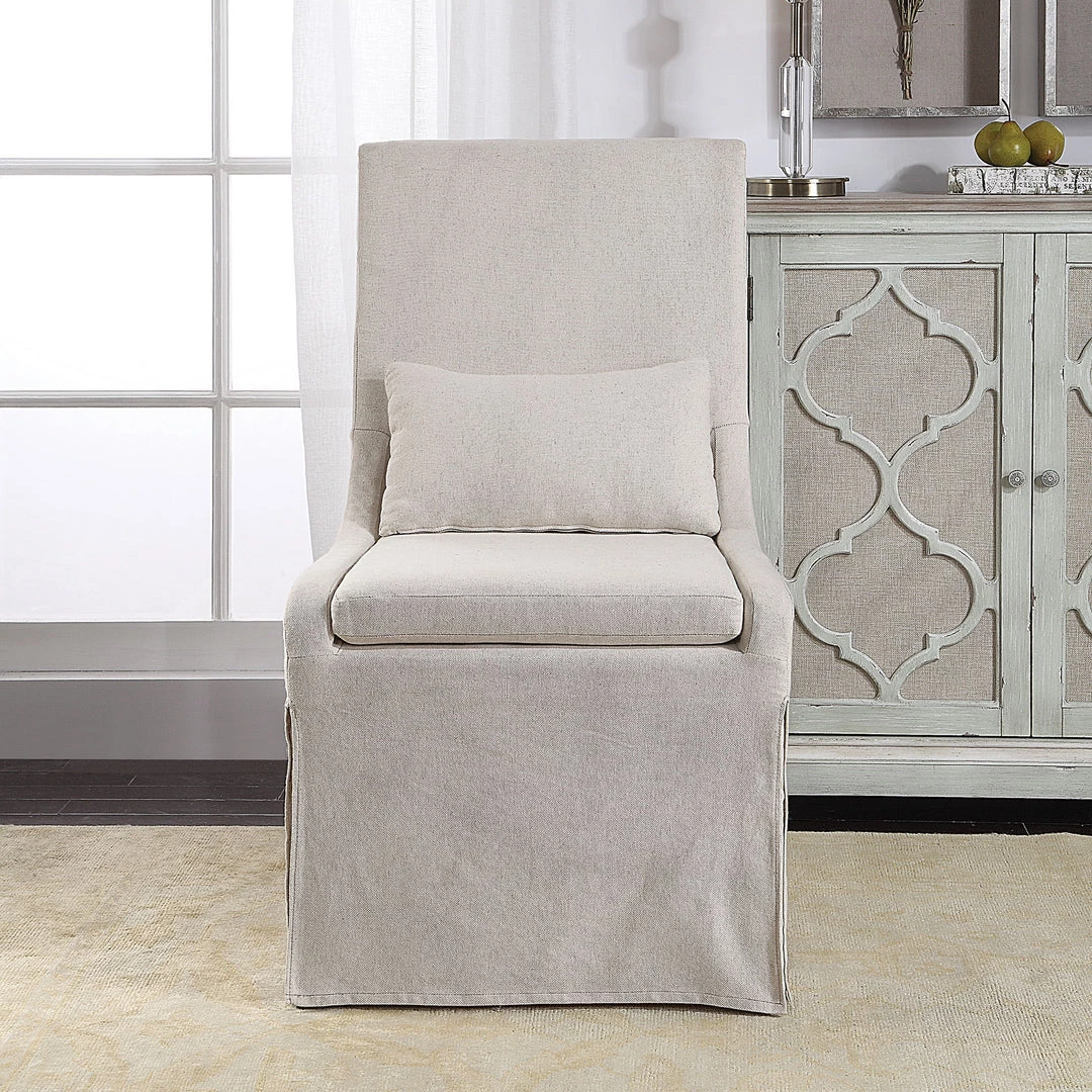 Simplistic In Form, This Casually Sophisticated Armless Chair Features A Tailored Off-white Linen Blend Slipcover With A Plush Cushion Seat And Kidney Pillow For Added Comfort. Seat Height Is 20″. Dry Clean Only.