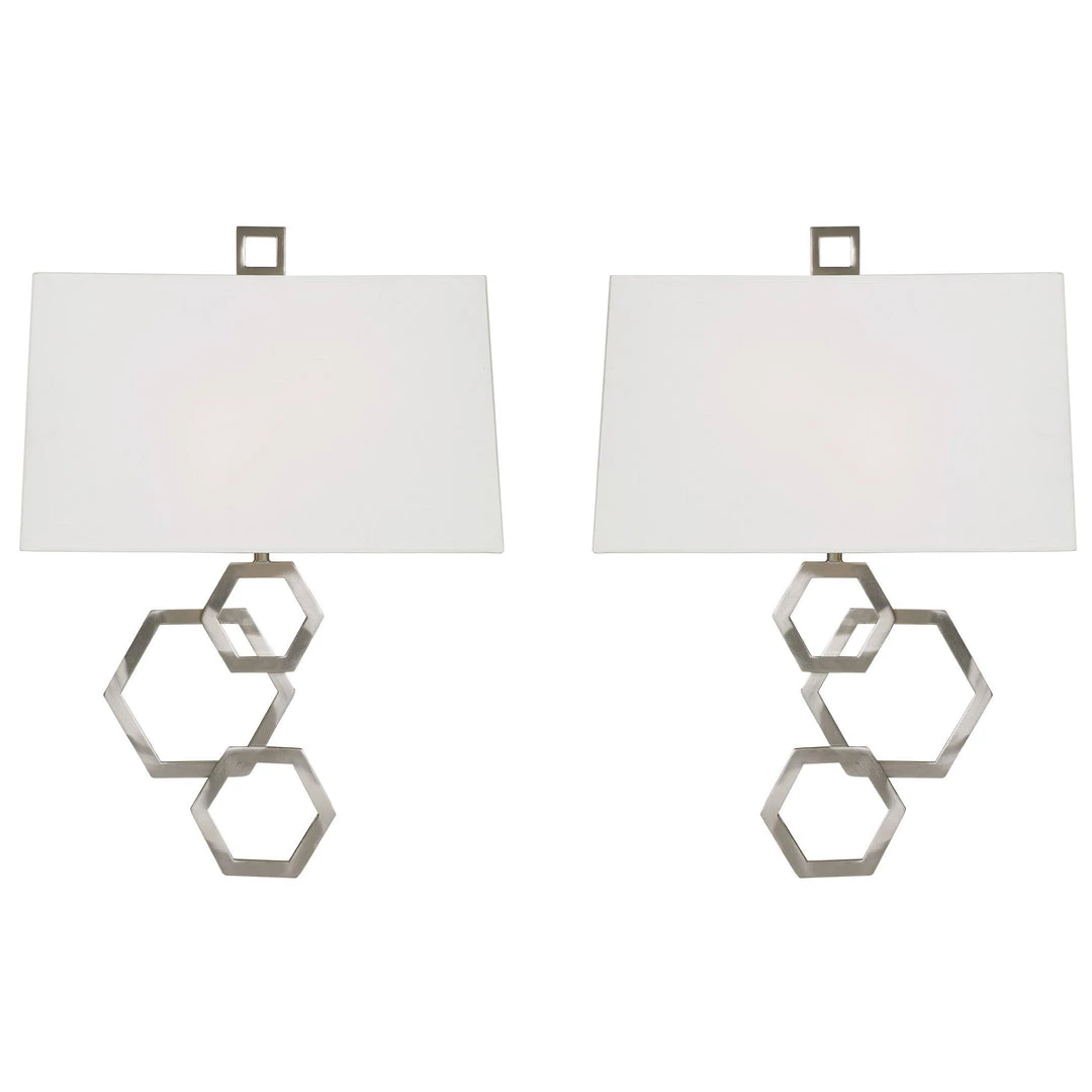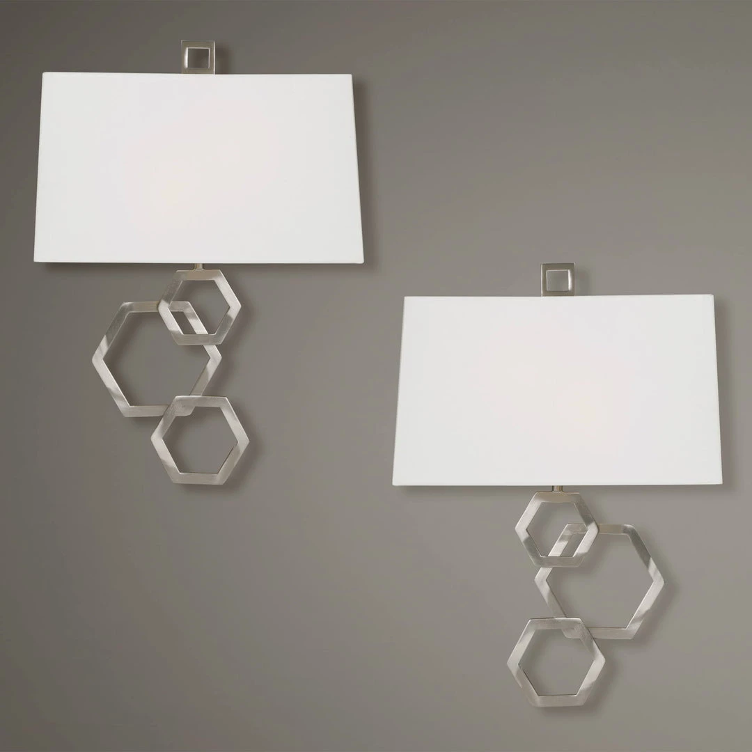 Our Rich Brushed Nickel 2 Lt Sconces With Stately Honeycomb Hexagon Geometric Cutout Shape Details And White Linen Hardback Shades Add Classic Elegance. Unique 2-pack Of Sconces, Featuring A Right And Left For A Balanced Set. 2-60 Watt Max, Candelabra Sockets In Each Sconce.
