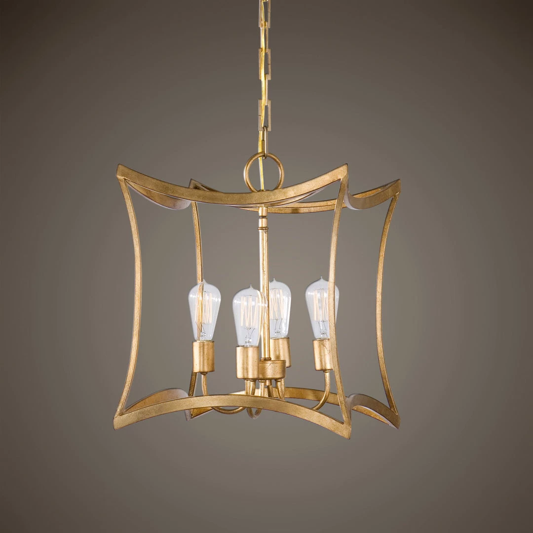Elegant Square Open Frame Pendant In A Rich Gold Leaf Finish. Includes 4-60 Watt ST58 Antique-style Bulbs. Supplied With 15′ Wire And 7′ Chain For Adjustable Installation.
