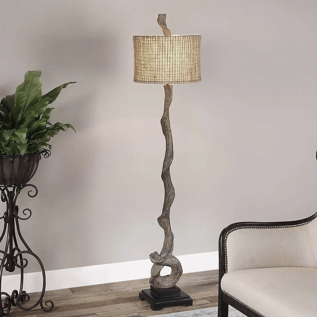 Weathered Driftwood Finish With A Matching Finial And A Matte Black Base. The Round Drum Shade Is Burlap Twine With An Open Weave Construction And A Beige Inner Liner.
