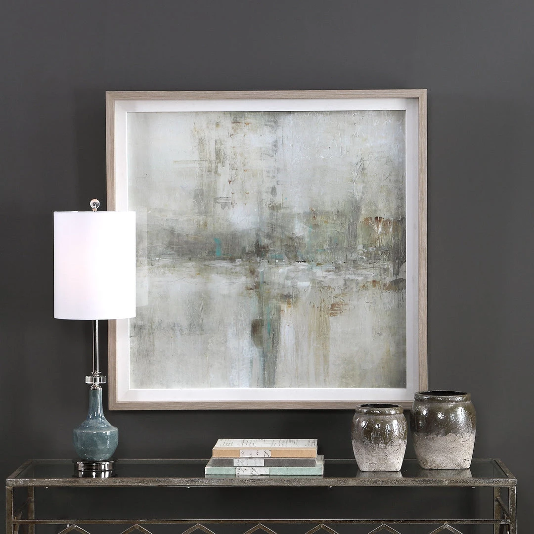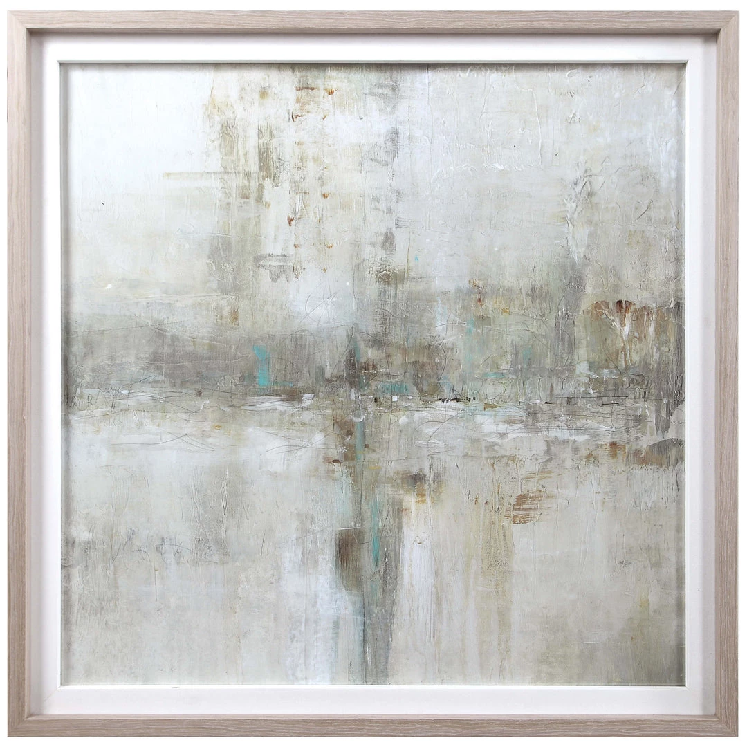 This Modern Abstract Print Features Hand Embellished Details That Add Dimension And Style. Shades Of Light Gray, Beige, And Tan Are Accented By Pops Of Turquoise And Rust. A Light Wood Frame With A Gray Wash And White Linen Inner Lip Complete This Piece. This Print Is Placed Under Protective Glass. Artwork By Tim O’Toole.