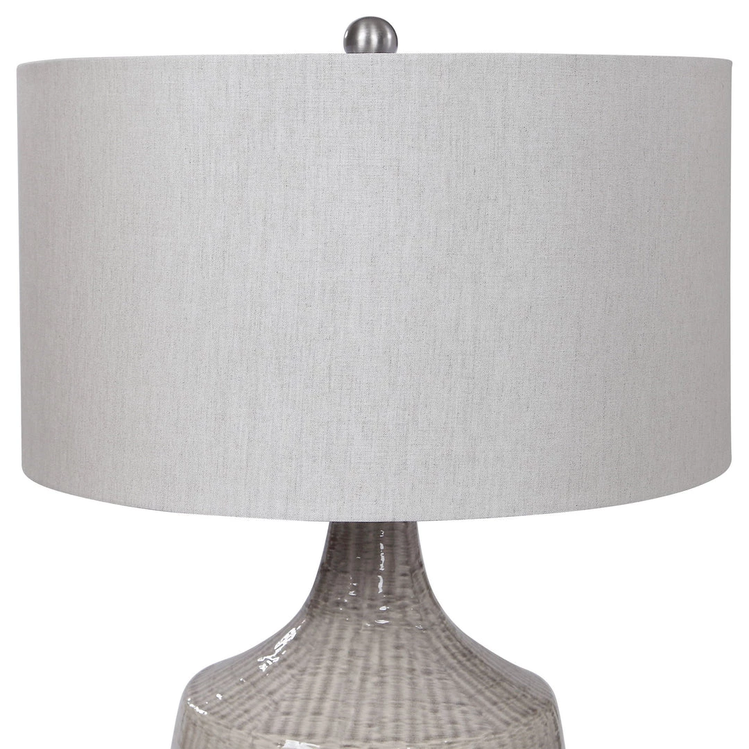 This Ceramic Base Keeps It Simple In Shape, Yet Upscale With Its Fashionable Pattern That’s Finished In A Distressed Light Gray Glaze, Paired With Brushed Nickel Plated Accents. The Hardback Drum Shade Is Light Gray Linen Fabric.