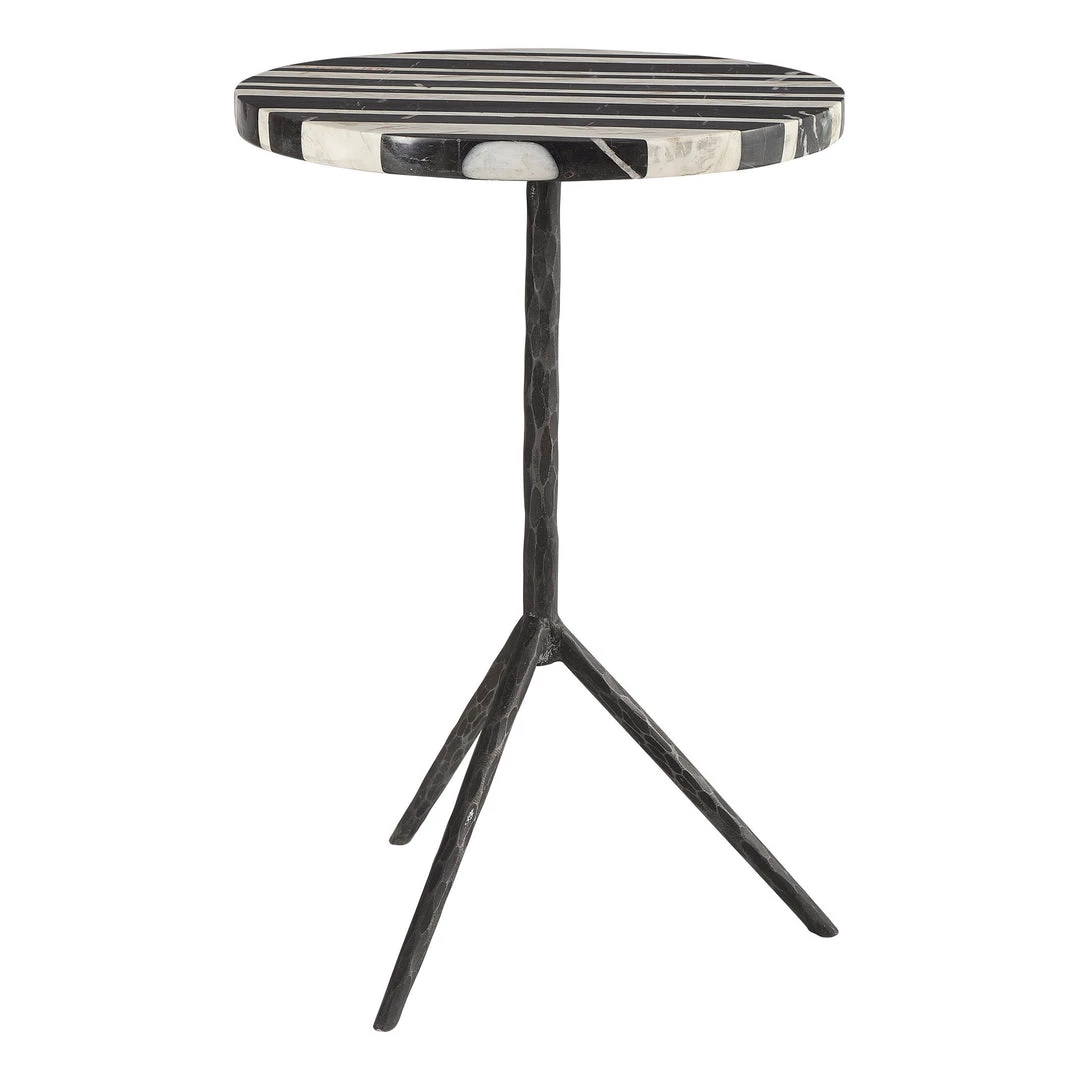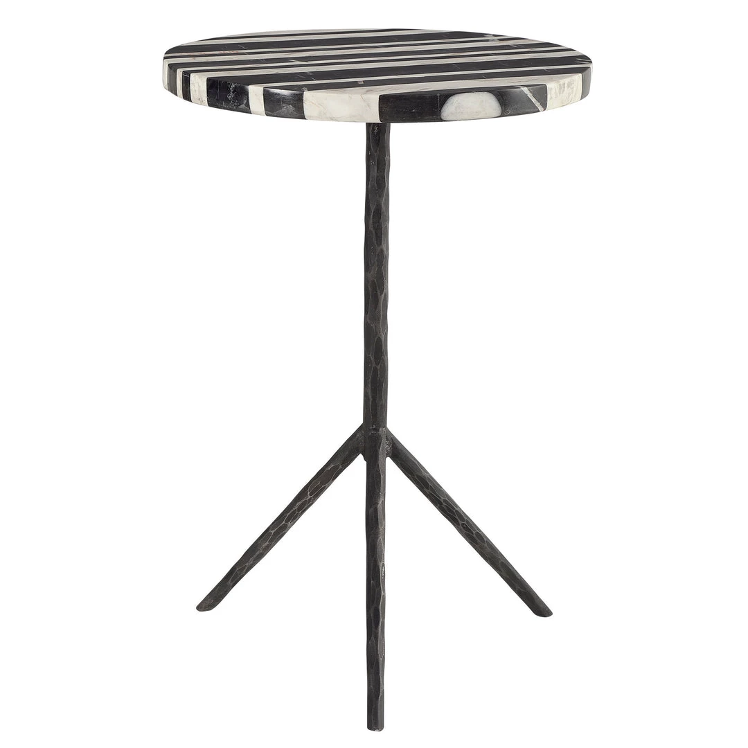 A Unique Blend Of Classic And Modern Details, This Round Accent Table Showcases An Asymmetrically Striped Black And White Marble Top Over A Chiseled Iron Tripod Base In A Naturally Distressed Aged Iron Finish. True To The Nature Of Natural Materials, Each Piece Will Have Unique Marbling And Veining Throughout.