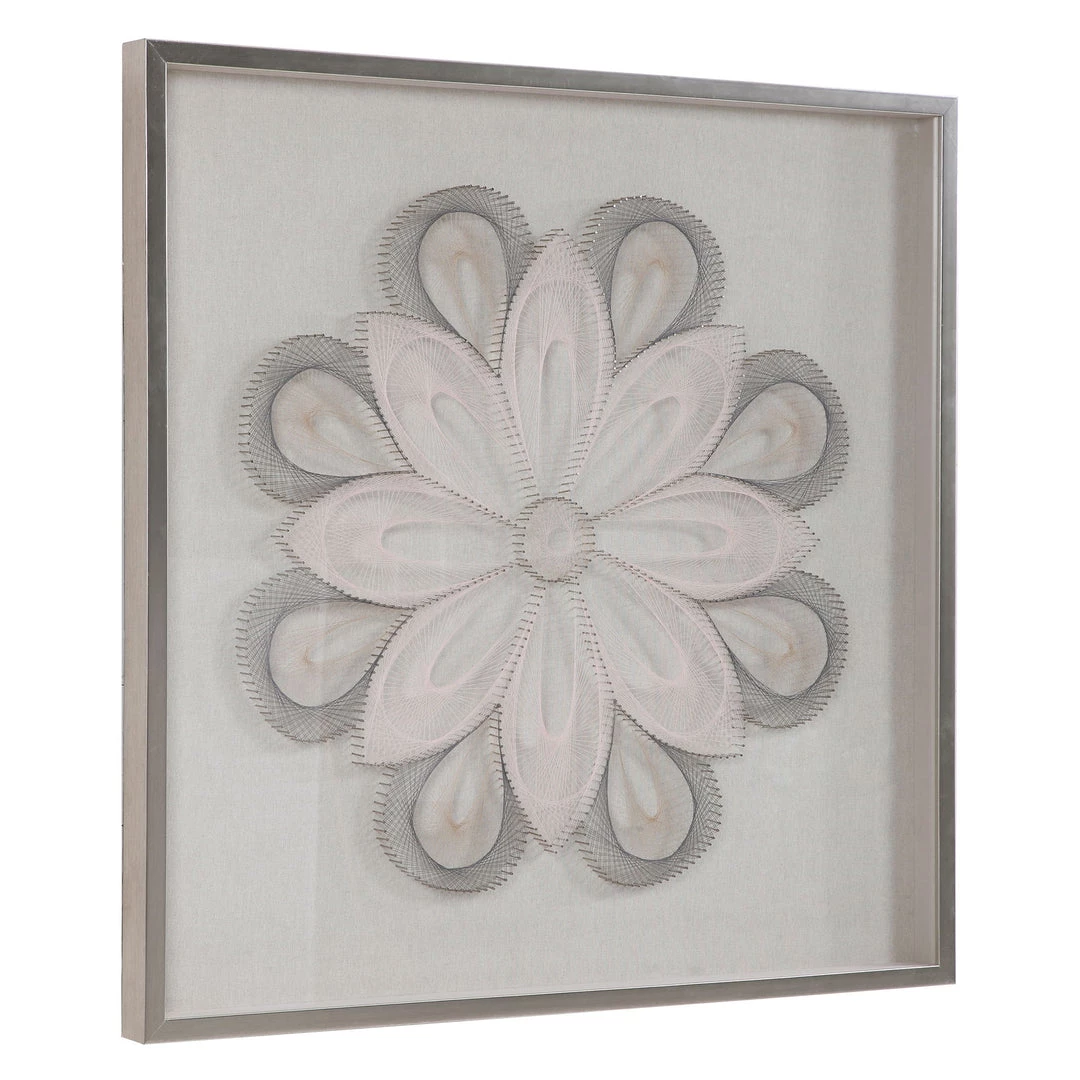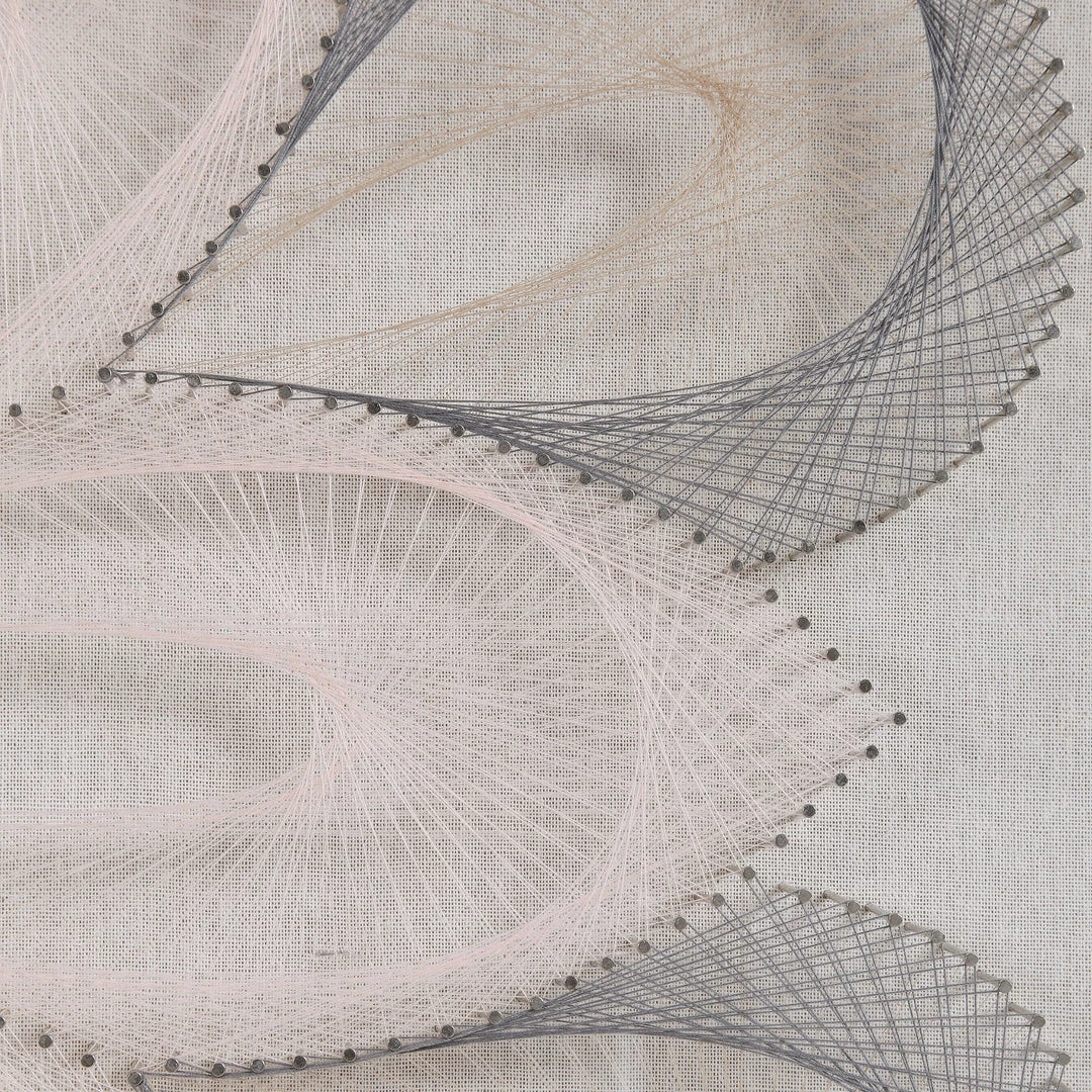 This Statement Making Shadow Box Features 3-dimensional Layered String Art, Hand Threaded Around Individually Hammered Pin Nails In Shades Of Slate Gray, Tan And Blush, Over A Neutral Linen Backing With A Silver Leaf Frame.