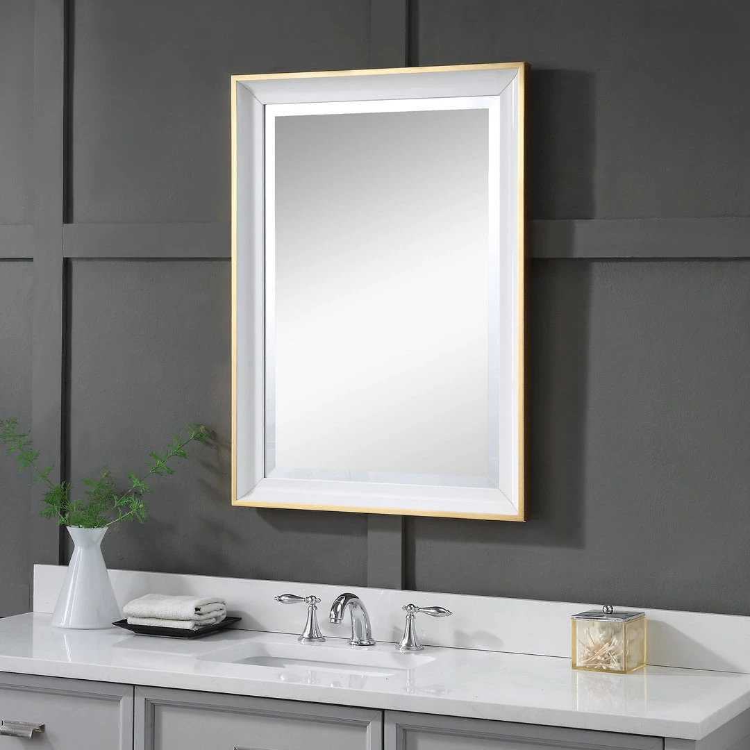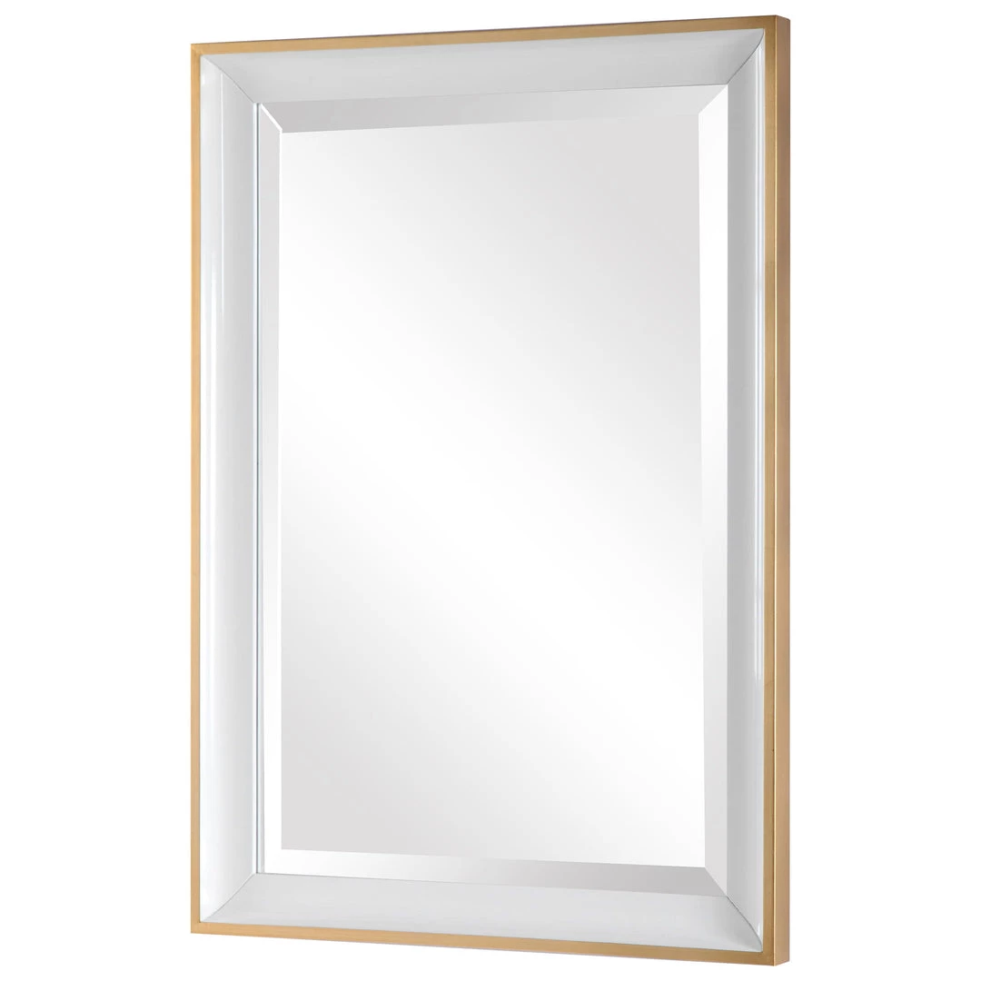 This Elegantly Refined Design Has A Large Gloss White Inner Frame Accented By A Petite Gold Leaf Outer Frame. The Mirror Has A 1″ Bevel And May Be Hung Horizontal Or Vertical.