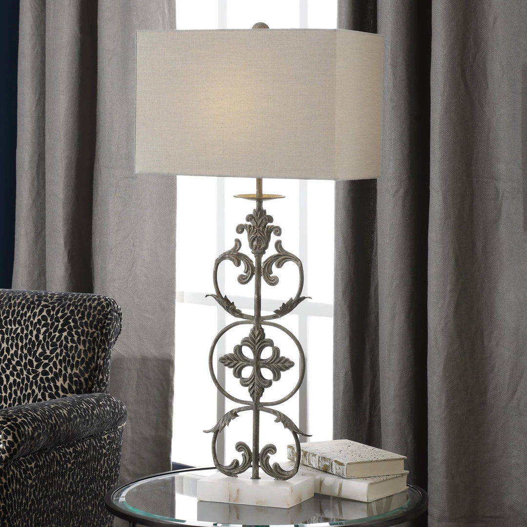 This Updated Look On A Traditional Style Features Hand Forged Iron Showcasing Timeless Flowing Leaf Designs, Finished In A Distressed Aged Bronze With Subtle Silver Undertones, Washed With A Rottenstone Glaze, Accented With A Polished White Marble Foot. The Rectangle Hardback Shade Is A Light Gray Linen Fabric.