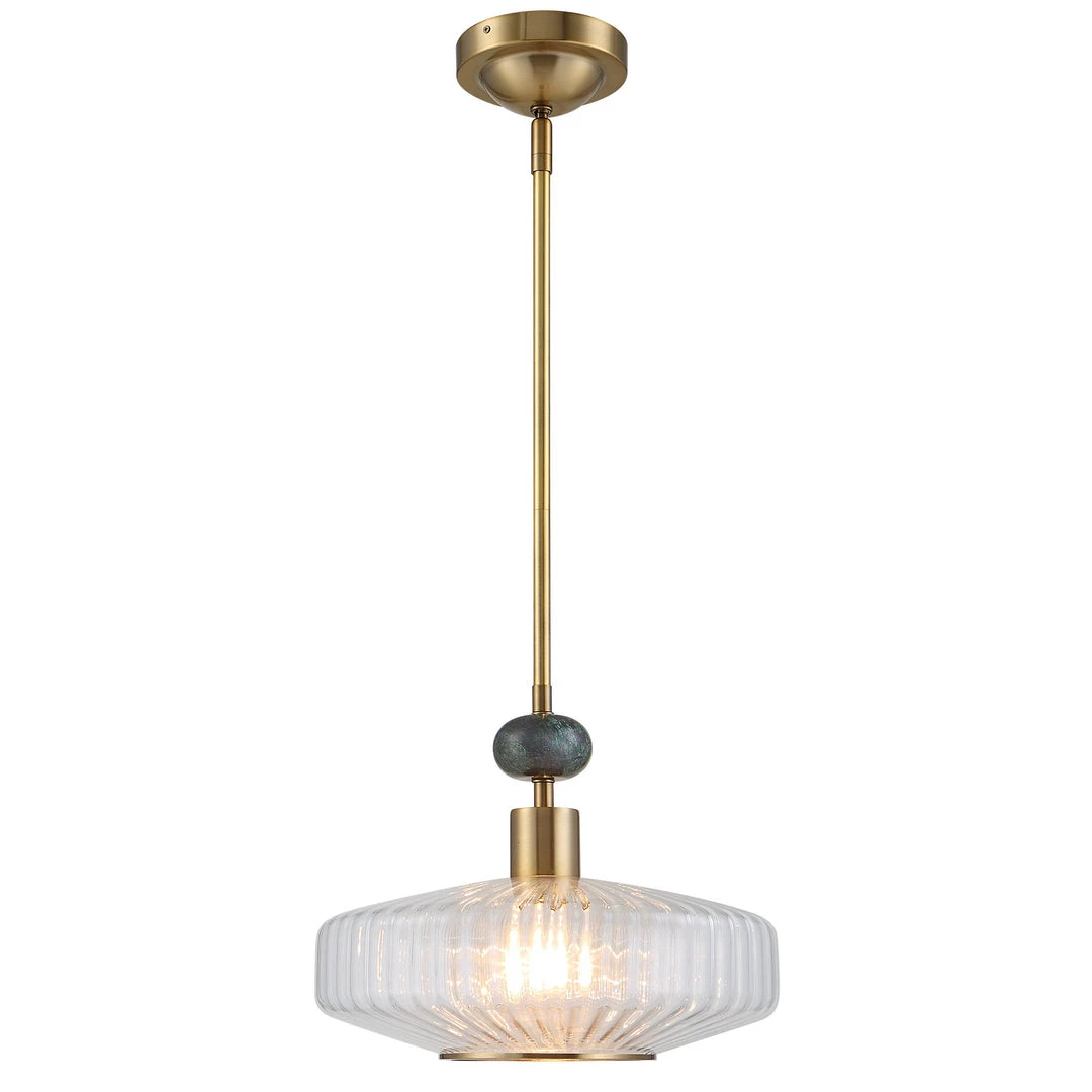 A Rich Green Marble Oval Sphere Is The Focal Accent Of This Modern 1 Lt. Pendant Finished In Warm Antique Brass With A Clear Ribbed Clean Edged Glass Shade. 1-60 Watt Max, Edison Socket. Supplied With 15′ Wire, 3-12″ Stems, And 1-6″ Stem For Adjustable Installation.