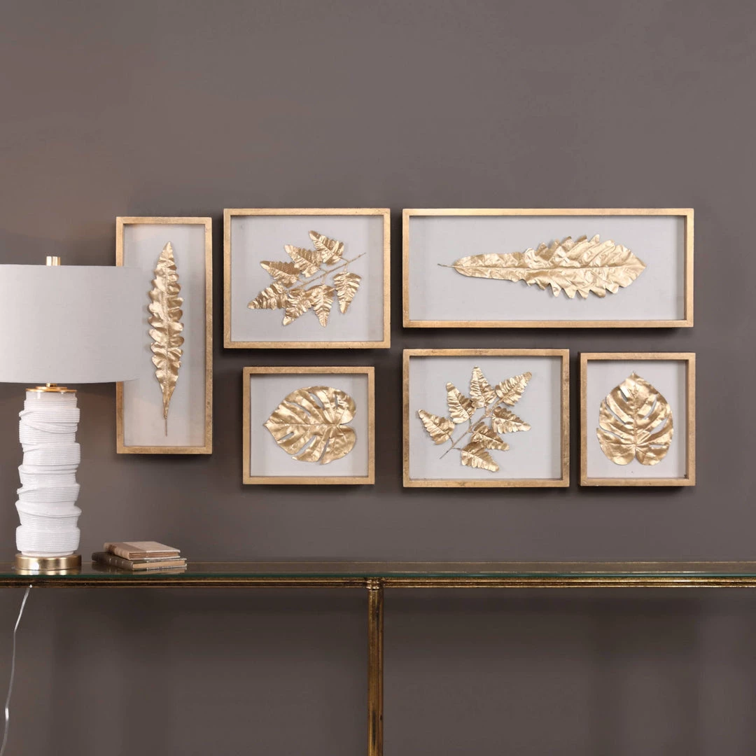 A Leaf Collection Study, Cut From Silk Fabric With Gold Leaf Overlay, On A Natural Linen Backing Showcased In Wooden Shadow Boxes Finished With Gold Leaf, All Under Glass. May Be Hung Horizontal Or Vertical. Sizes: 9x22x2 (1), 11x13x2 (2), 13x16x2 (2), 11x28x2 (1)