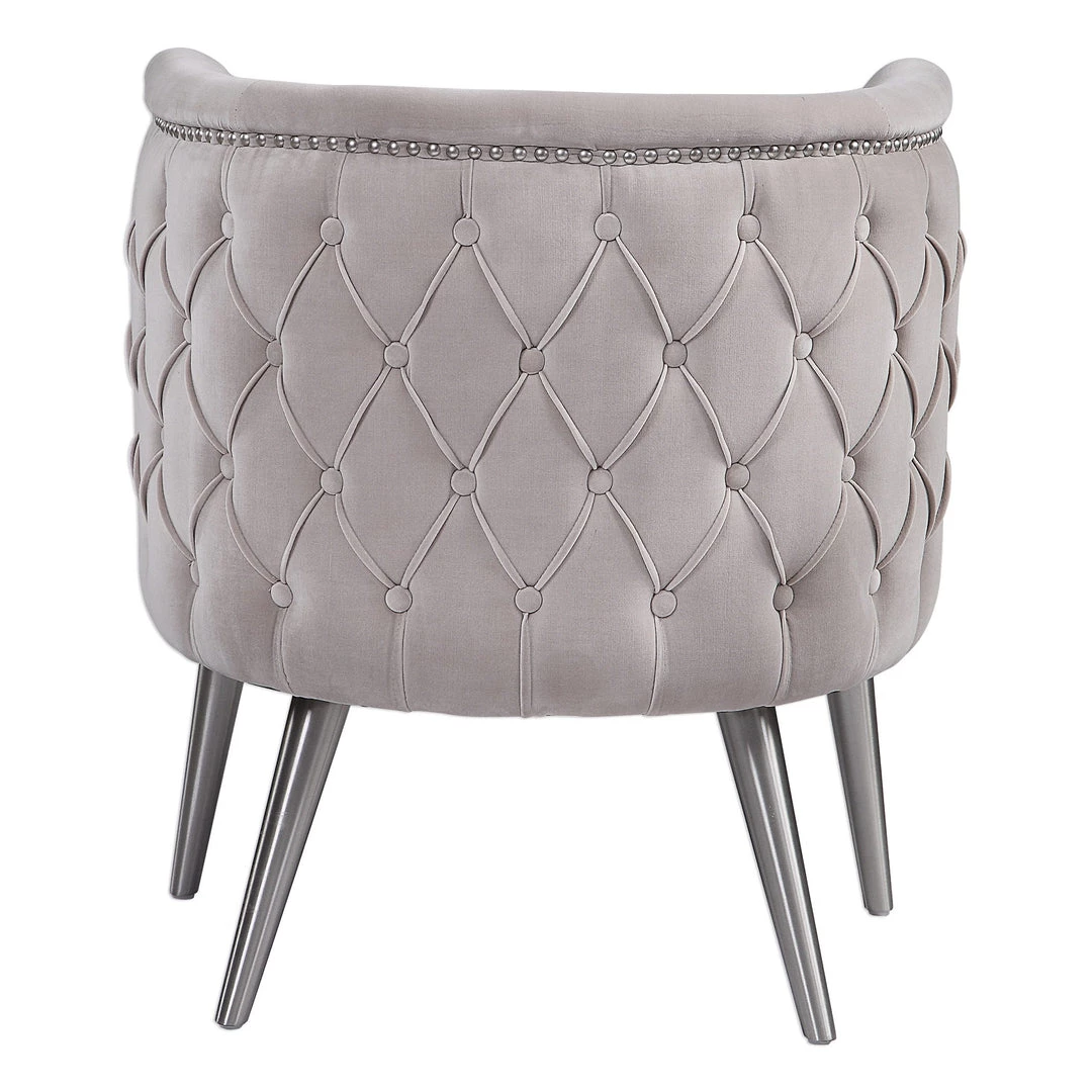 This Stylish Barrel Chair Features A Plush Diamond Button Tufted Outside In A Luxurious Champagne Velvet, Lined With Antique Nickel Nail Head Trim, On Metal Tapered Dowel Legs Finished In Brushed Nickel. Seat Height Is 19″.