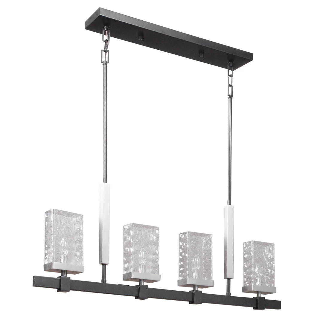 Clean Transitional 4 Lt. Island With A Textured Black Finish And Brushed Nickel Accents, Featuring Unique Rectangular Clear Watered And Micro Seeded Glass. With 4-60 Watt Max, Candelabra Sockets And Includes 20′ Wire, 6-12″ Stems And 2-6″ Stems For Adjustable Installation.