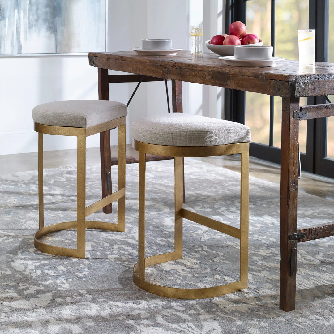 Simplistic But Sturdy, This Statement Counter Stool Features A Thick Hand Forged Iron Base Finished In A Mottled Antique Gold Leaf. Plush Seat Is Tailored In An Off-white Linen Blend Fabric. Seat Height Is 26″.
