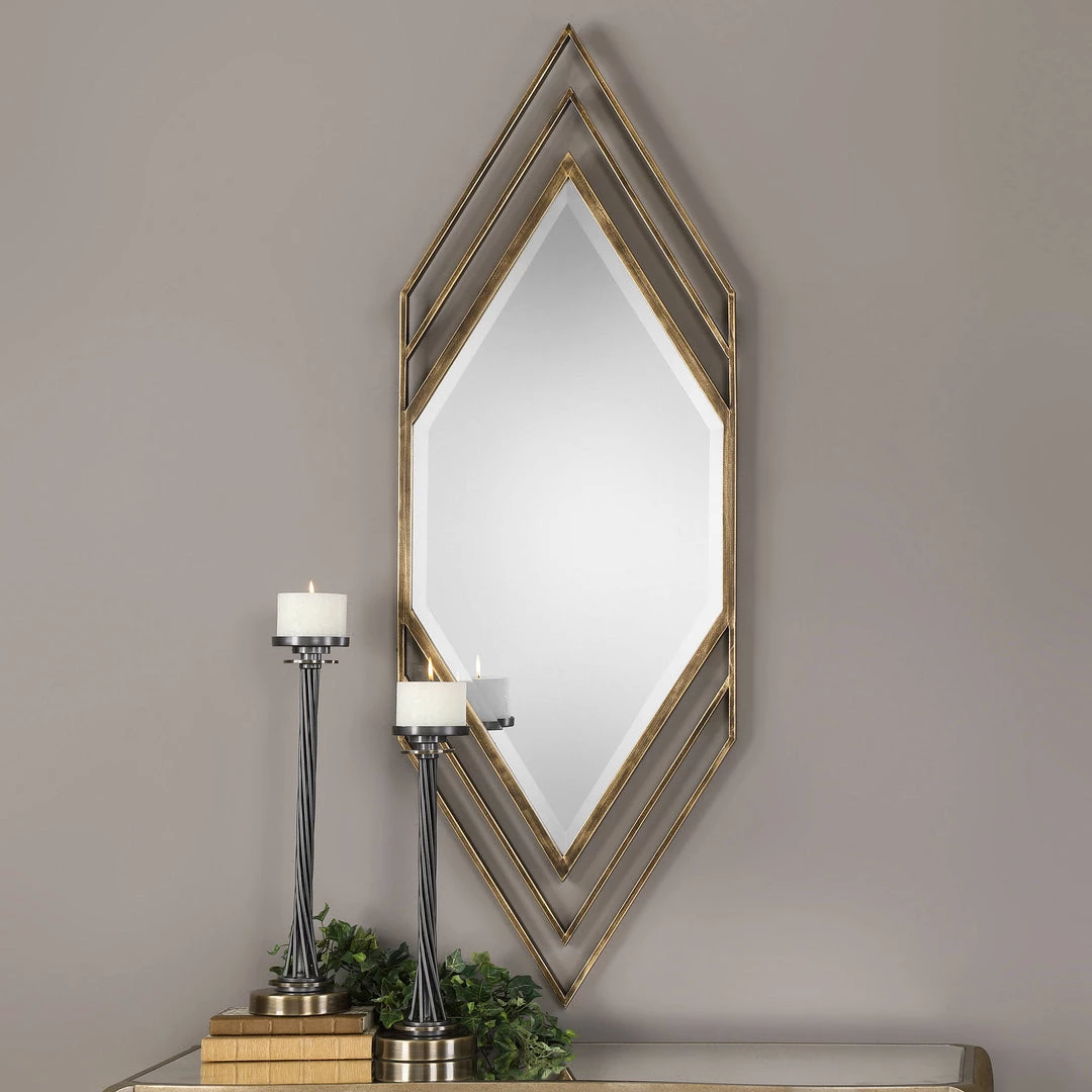 This Forged Iron Frame Features A Chevron Inspired Design, Hand Finished In A Metallic, Golden Bronze Leaf. Mirror Has A Generous 1 1/4″ Bevel And May Be Hung Horizontal Or Vertical.