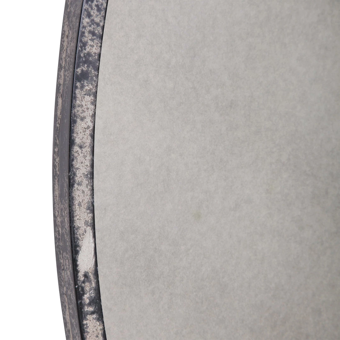 Industrial Style Round Mirror Features A Petite Metal Frame Finished In Rustic Black With Aged White Distressing, Surrounding An Antique Style Mirror.
