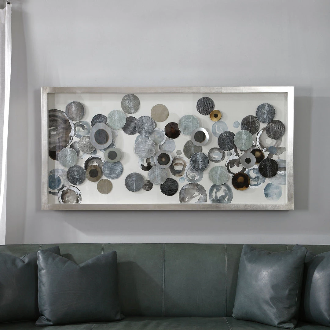 Abstract In Design, This Art Features Overlapping, Blow Torched Iron Discs With Hand Painted Acrylic Accents In Tones Of Silver, Brown, Blue, And Green. The Art Is Under Glass And Is Encased By A Lightly Antiqued Silver Leaf Shadow Box. May Be Hung Horizontal Or Vertical.