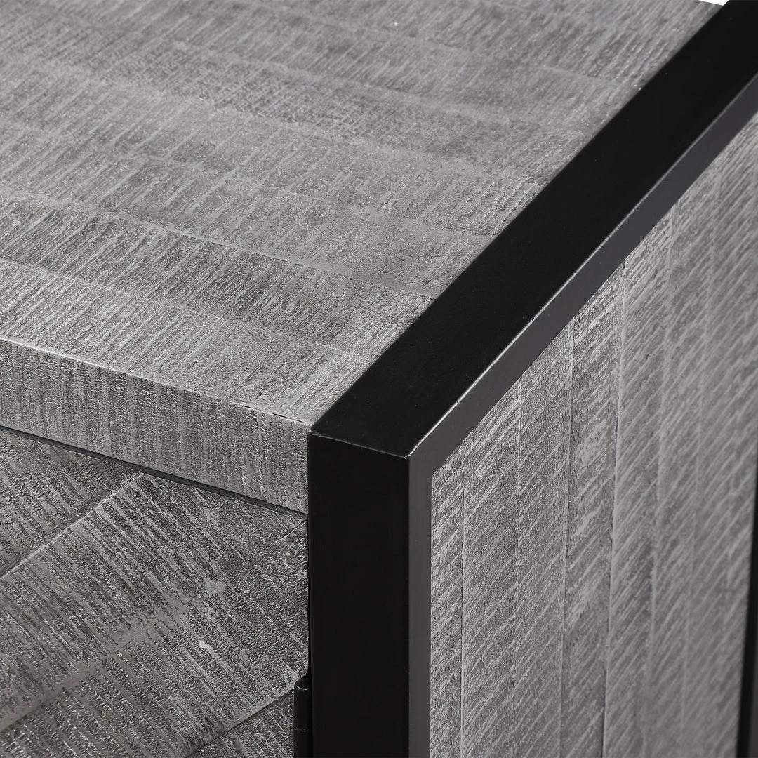 Showcasing Ties To Bohemian And Global Styles, This Versatile Two Door Cabinet Features A Chiseled Herringbone Pattern In Light Gray And Charcoal Finished Pine Wood With Silver Leaf Highlights, And Accented With Matte Black Iron Hardware And Framework Details. The Charcoal Finished Interior Contains Two Fixed Shelves.