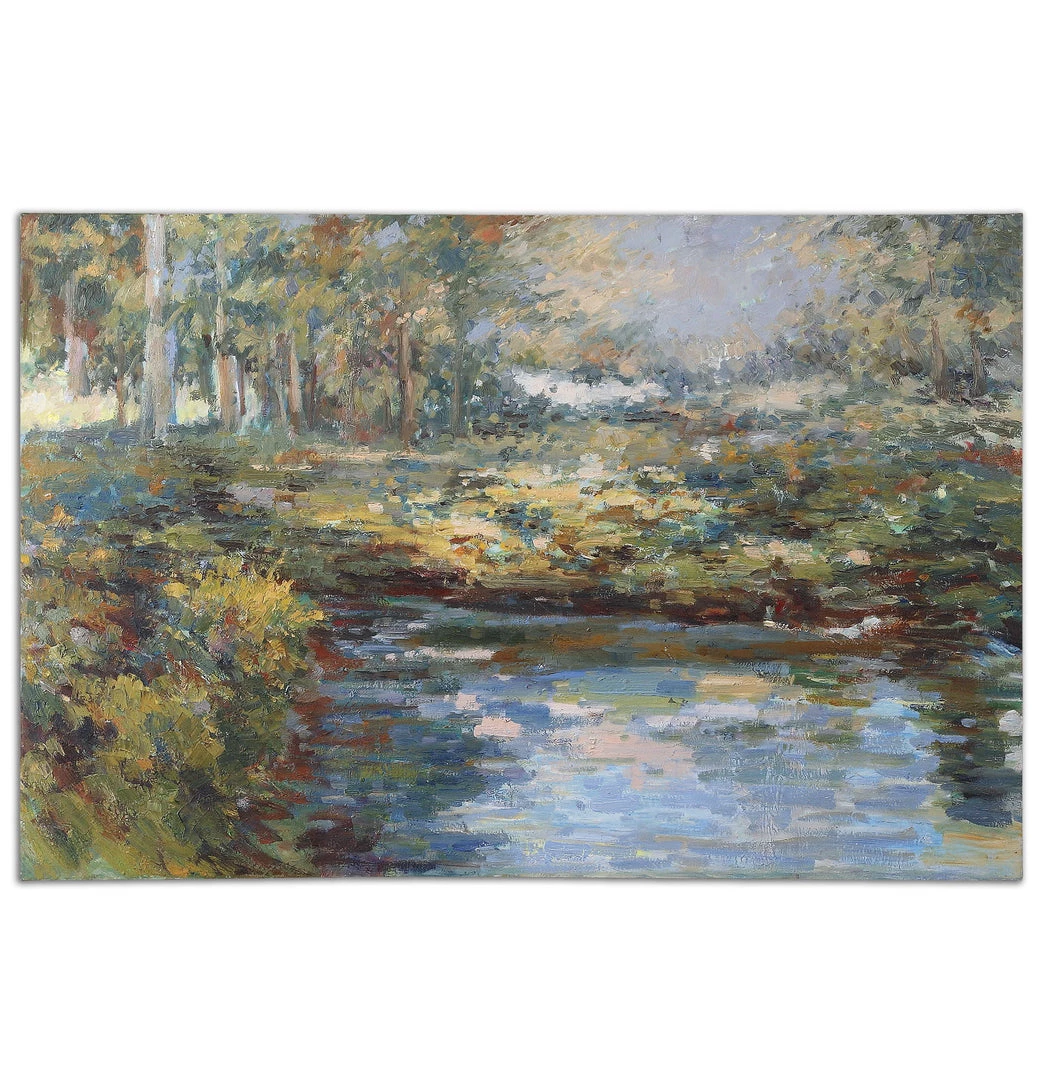 Reminiscent Of Impressionist Style Artwork, This Hand Painted Oil On Canvas Showcases A Timeless, Landscape Design. The Frameless Piece Is Awash In Blue, Green, White, And Bronze Tones. The Canvas Is Stretched And Attached To Wood Stretching Bars. Due To The Handcrafted Nature Of This Artwork, Each Piece May Have Subtle Differences.