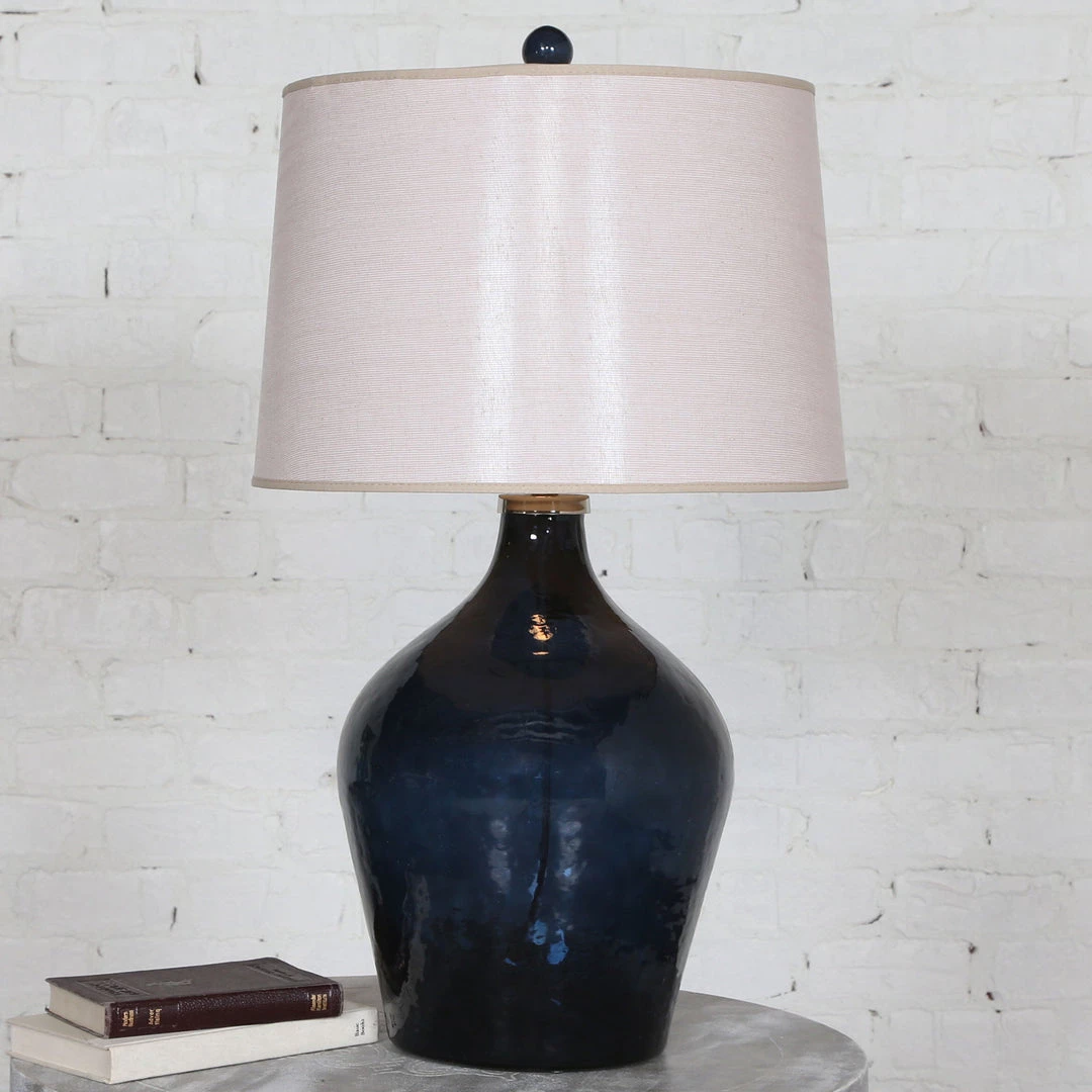 Lightly Hammered, Midnight Blue Glass Accented With Polished Nickel Plated Details. The Round, Tapered, Hardback Shade Is A Beige Linen Fabric With Light Slubbing.