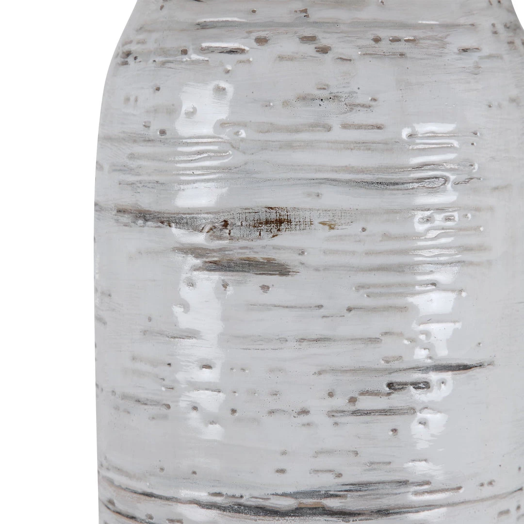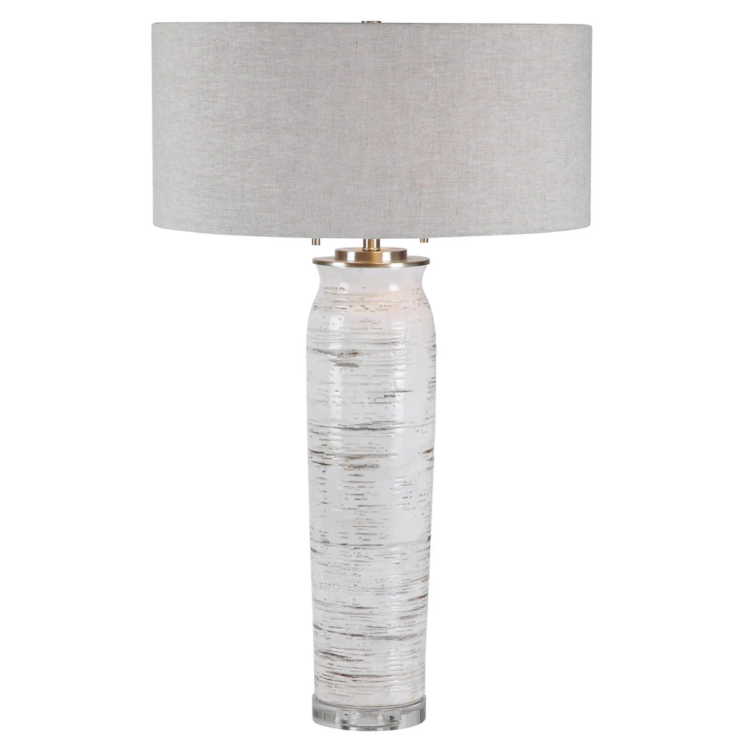 Inspired By The Bark Of A Birch Tree, This Table Lamp Features A Ceramic Base Finished In Off-white With Rust-colored Accents And Noticeable Texture And Distressing. The Piece Also Has A Crystal Foot And Brushed Nickel Details. The Round Hardback Shade Is A Light Oatmeal Linen Fabric With Slubbing.