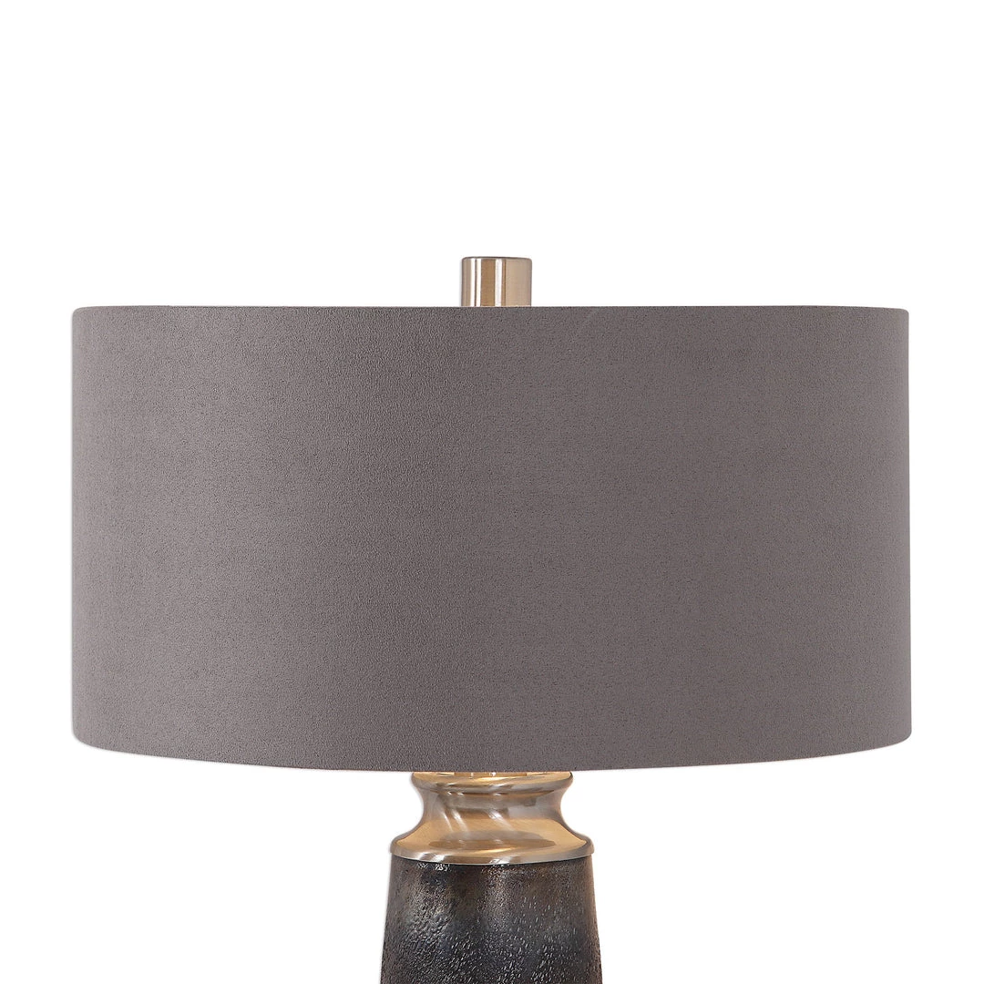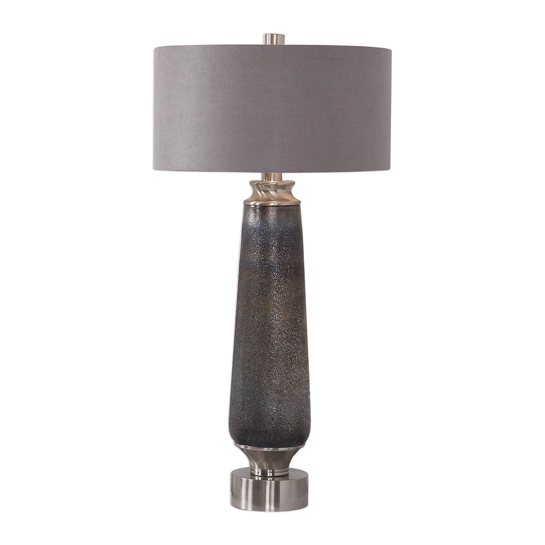 Modern Style Exudes From This Textured Glass Table Lamp Featuring Mottled Shades Of Deep Blue Mixed With Hues Of Rust Copper Creating A Unique, Handcrafted Look That’s Paired With Brushed Nickel Plated Details. The Round Drum Shade Is A Charcoal Gray Sueded Fabric.