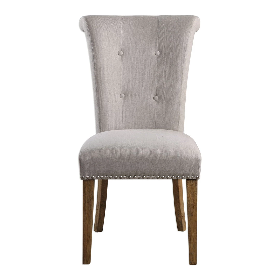 Versatile Elegance For Dining Room, Office Or Living Room, The Sleek Flared Button Accented Back And Plush Seat Cushion Are Accentuated With Silver Finished Nail Heads. Tightly Tailored In A Durable Neutral Oatmeal Woven Fabric With Tapered Light Sandalwood Finished Legs. Seat Height Is 20”.