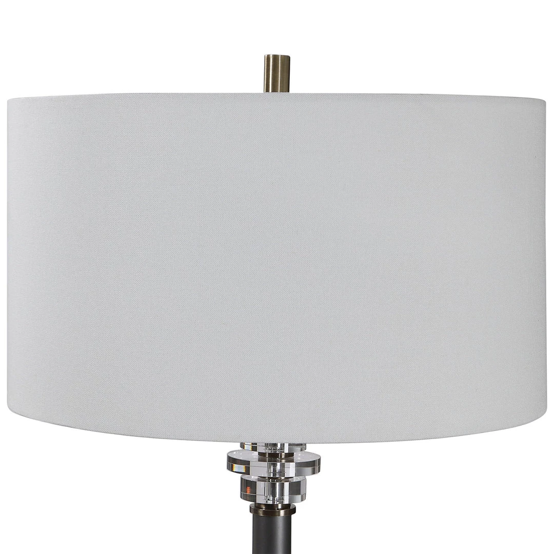 Transitional In Design, This Floor Lamp Features A Sleek Steel Base Finished In A Dark Bronze, Accented With Antique Brass Plated Details And Crystal Ornaments. The Round Hardback Shade Is A White Linen Fabric.