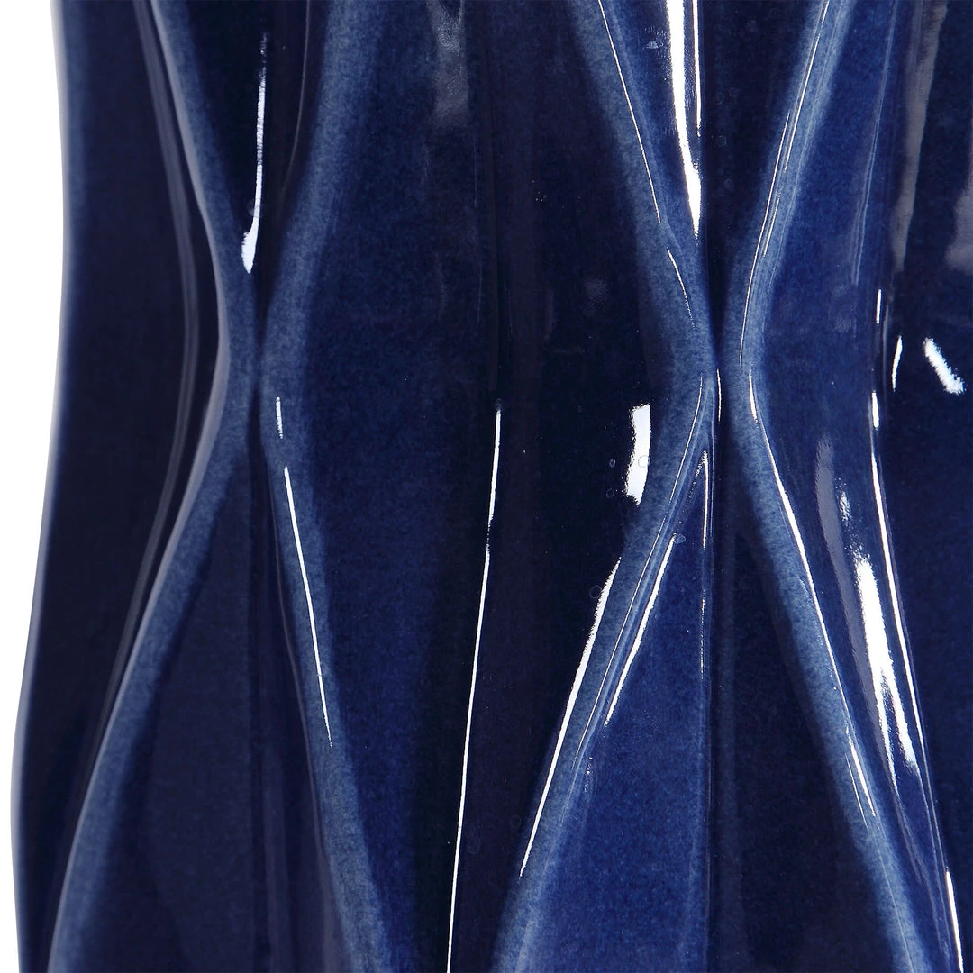 Showcasing A Modern Style, This Ceramic Table Lamp Features An Embossed Geometric Pattern In A Glossy, Deep Cobalt Hue With Subtle Rub-through. Polished Nickel Details And A Crystal Finial Are Paired With This Design. A Round Hardback Shade In White Linen Fabric Complements This Piece.