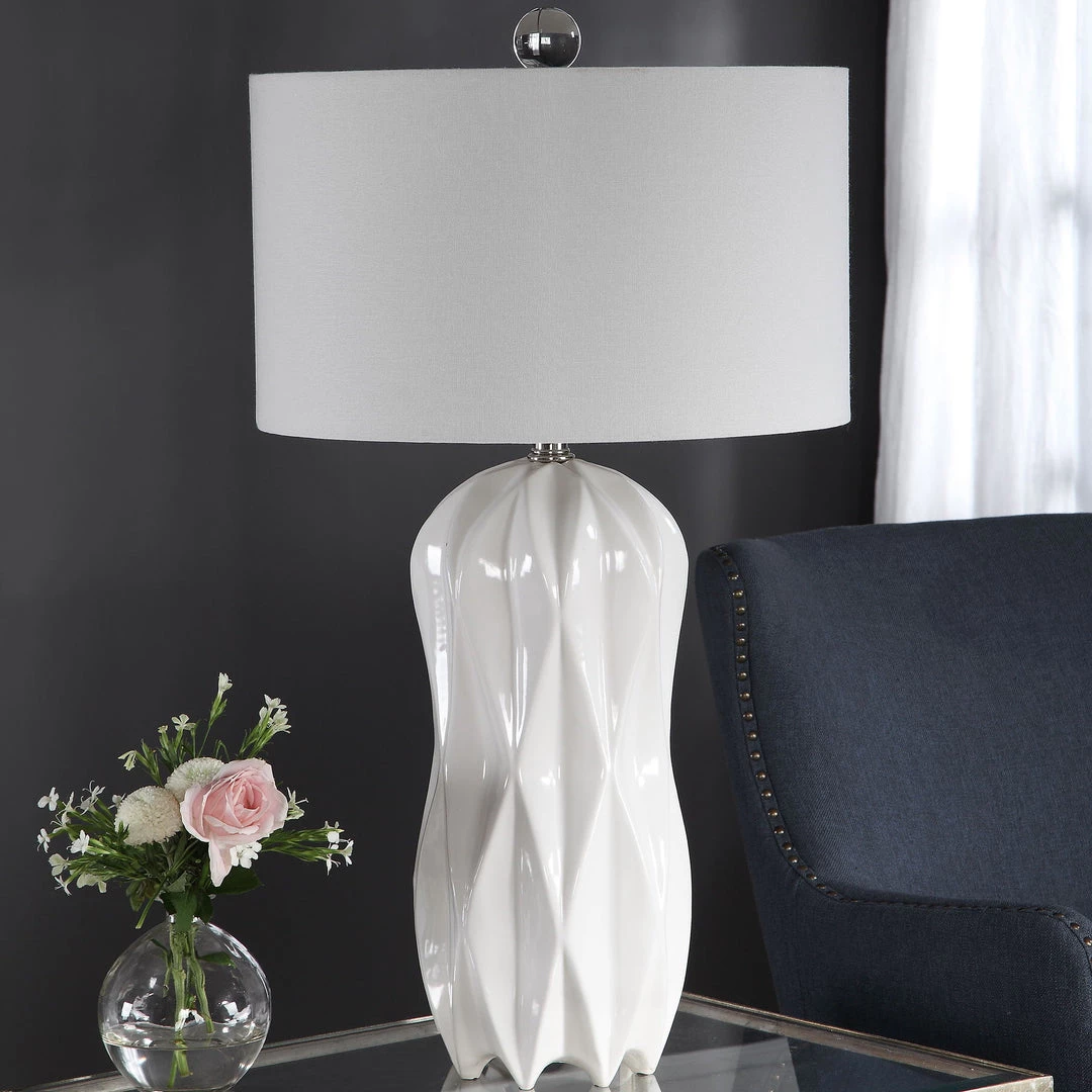 Modern Style Emanates From This Table Lamp With An Embossed Geometric Pattern Finished In A Glossy White Glaze Accented With Polished Nickel Details And A Crystal Finial. A Round Hardback Shade In White Linen Fabric Complements This Piece.