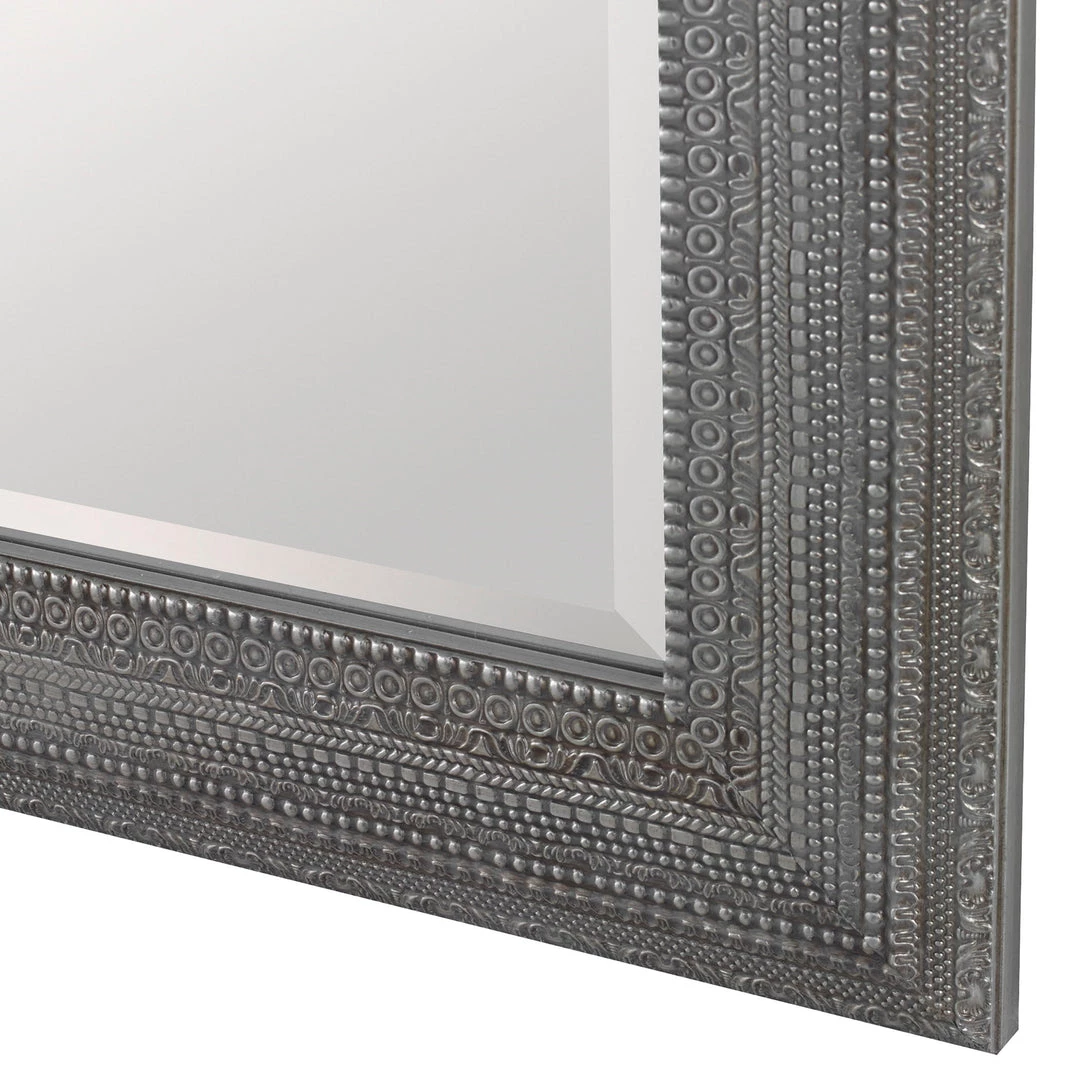 Frame Features An Antiqued Silver Champagne Finish With A Light Gray Wash. Mirror Is Beveled And May Be Hung Horizontal Or Vertical.