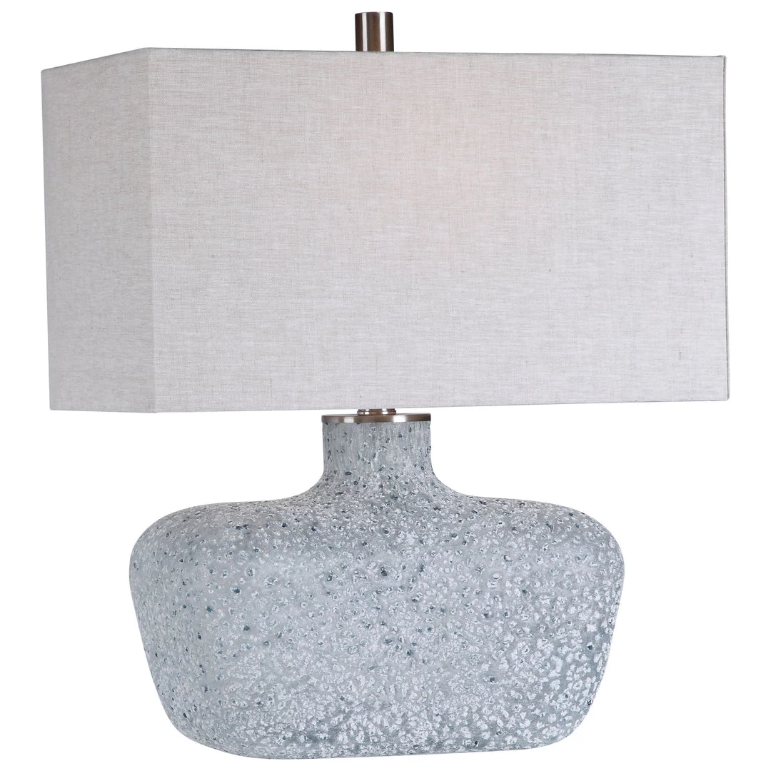 This Table Lamp Features A Heavily Textured Art Glass Base With A Handcrafted Look In Mottled Highlights Of Blue-green, Covered In An Aged White Frosted Glaze, Paired With Brushed Nickel Plated Details. The Rectangle Shade Is A Light Gray Linen Fabric With Natural Slubbing.