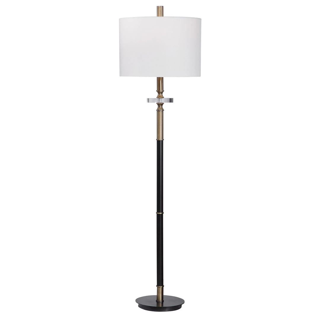 Traditional Elegance Is Showcased In This Floor Lamp, Finished In An Aged Black With Antique Brass Plated Accents And A Thick Crystal Ornament. The Round Hardback Drum Shade Is A White Linen Fabric.