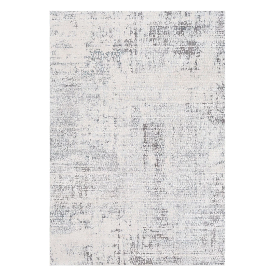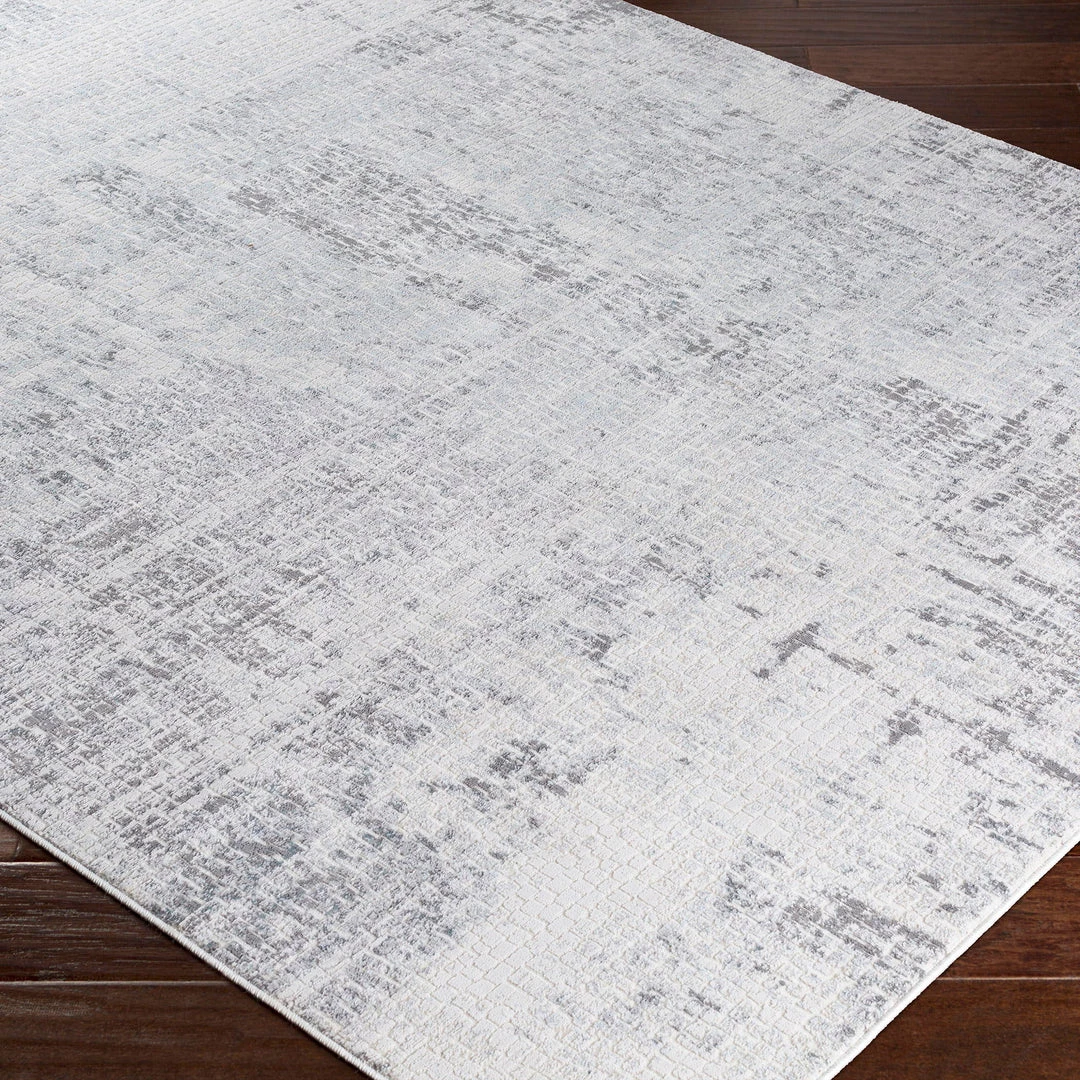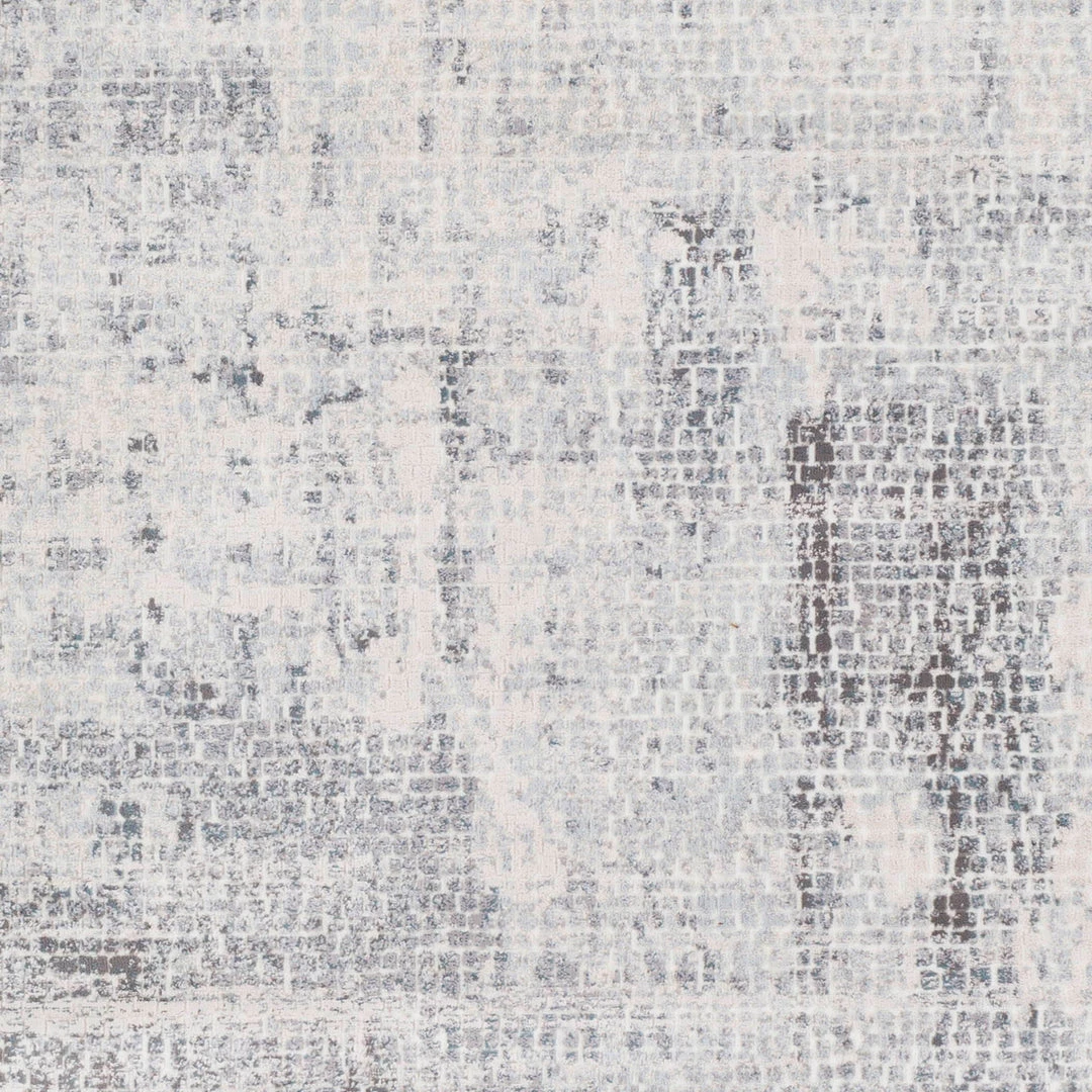 This Machine Woven Rug Features An Abstract Design In Tones Of White, Light Gray, Subtle Charcoal, And Hints Of Ice Blue, Constructed From Lustrous Polyester.