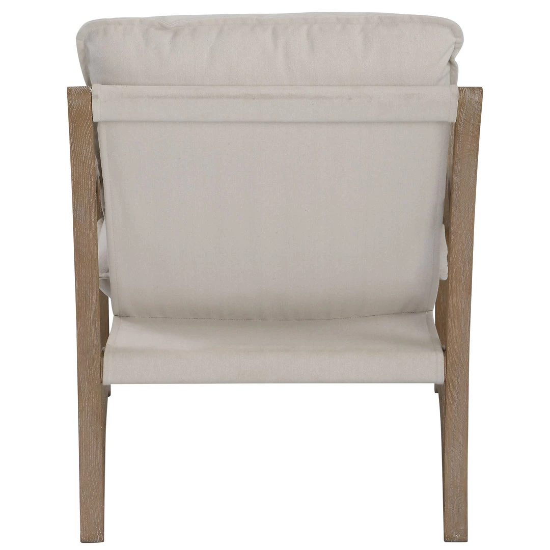 Modern Yet Casual, This Stylish Accent Chair Boasts A Sculptural Open Frame Made From Solid Oak In A Natural Wire Brush Ceruse Finish. Each Plush Cushion Is Upholstered In A Natural Linen Toned Fabric, In A Sling Seat Perfect For Lounging. Seat Height Is 18″.