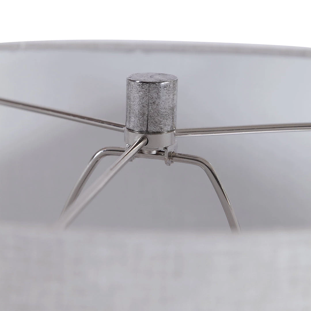 Finished In A Charcoal Glaze With Etched Texture, This Table Lamp Adds A Casual Yet Contemporary Feel To A Space. The Round Ceramic Base Is Complemented By Brushed Nickel Hardware. A Round Hardback Drum Shade In Oatmeal Linen Completes The Piece.