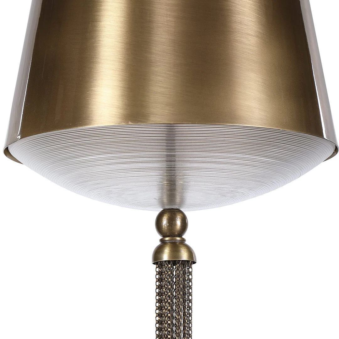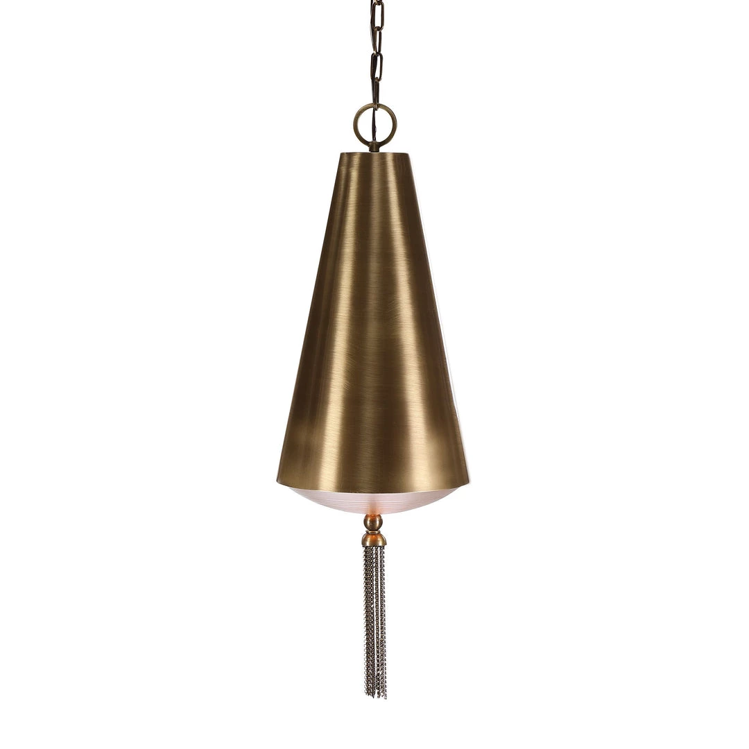 Exotic Chain-hung 1 Lt. Pendant With A Flared Cone Shade In Antique Brass With Convex Concentric Circle Glass Diffuser And A Wonderful Antique Brass, Oversized Tassel Finial. With 1-100 Watt Max, Edison Socket And Includes 12′ Wire And 5′ Chain For Adjustable Installation.