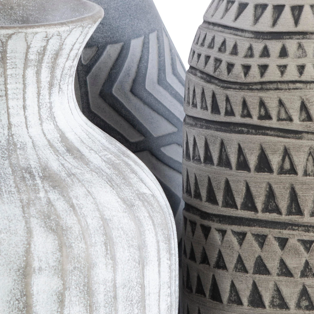 Set Of Three Earthenware Vases Are Finished In Light Gray, Charcoal And Natural Beige With Etched Geometric Patterns. Sizes: S-7x12x7, M-10x13x10, L-7x18x7