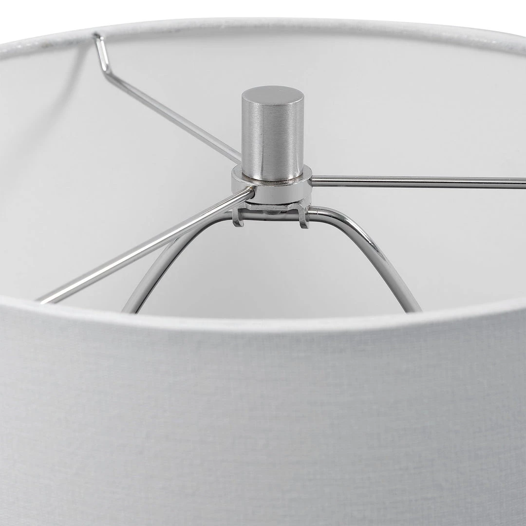 Simple Yet Versatile, This Accent Lamp Is Finished In A Light Gray Crackle Glaze With Subtle Striped Accents And Brushed Nickel Details. The Lamp Is Paired With A White Linen Drum Shade.