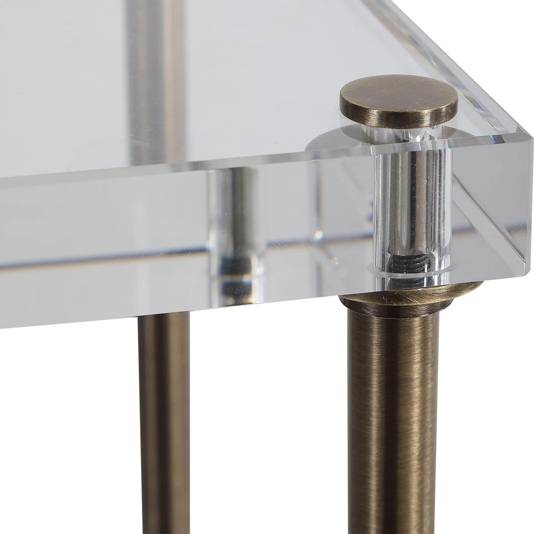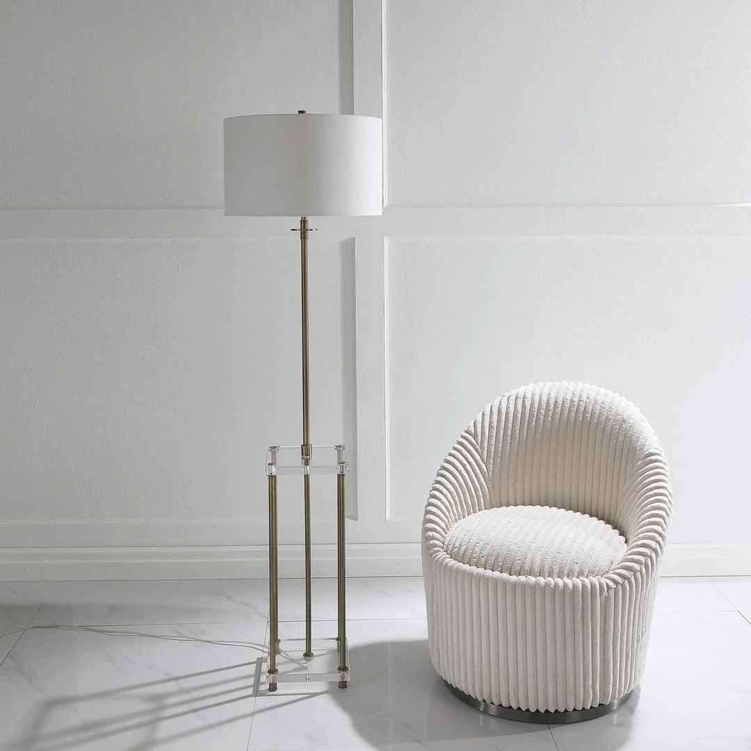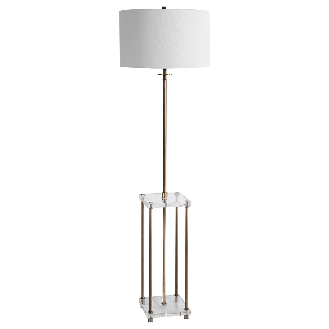 Sophisticated And Elegant, This Floor Lamp Displays A Transitional Look With Sleek Iron Details Finished In A Plated Antique Brass And Thick Crystal Shelves. The Drum Shade Is Covered In A White Linen Fabric.