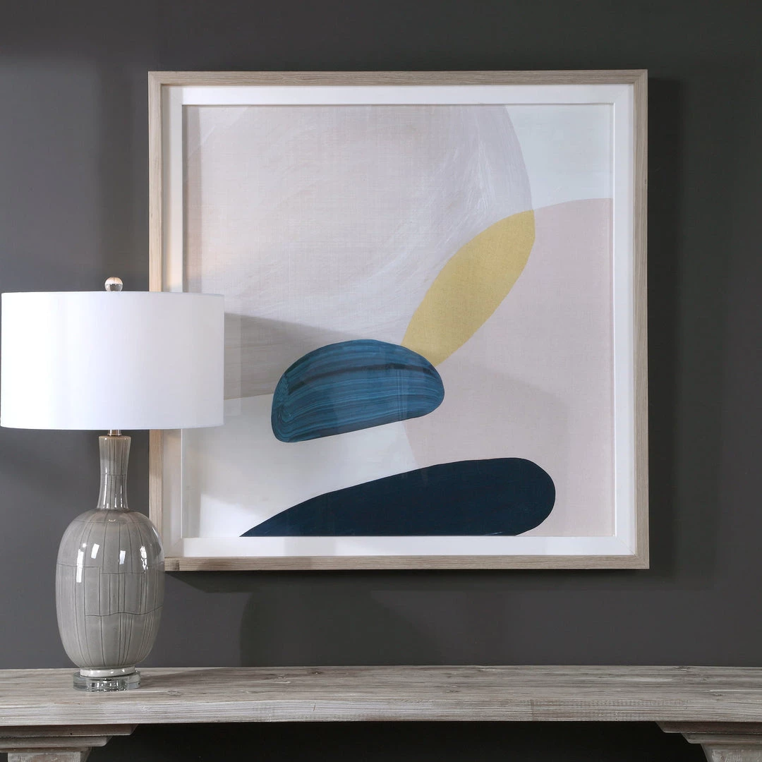 Scandinavian And Mid-century Styles Merge To Create This Colorful, Abstract Print. Shades Of Light Pink, Powder Blue, Navy, And Mustard Are Complemented By A Light Wood Frame And A White Linen Inner Liner. This Artwork Is Placed Under Glass. Artwork By Pi Studio Artist.