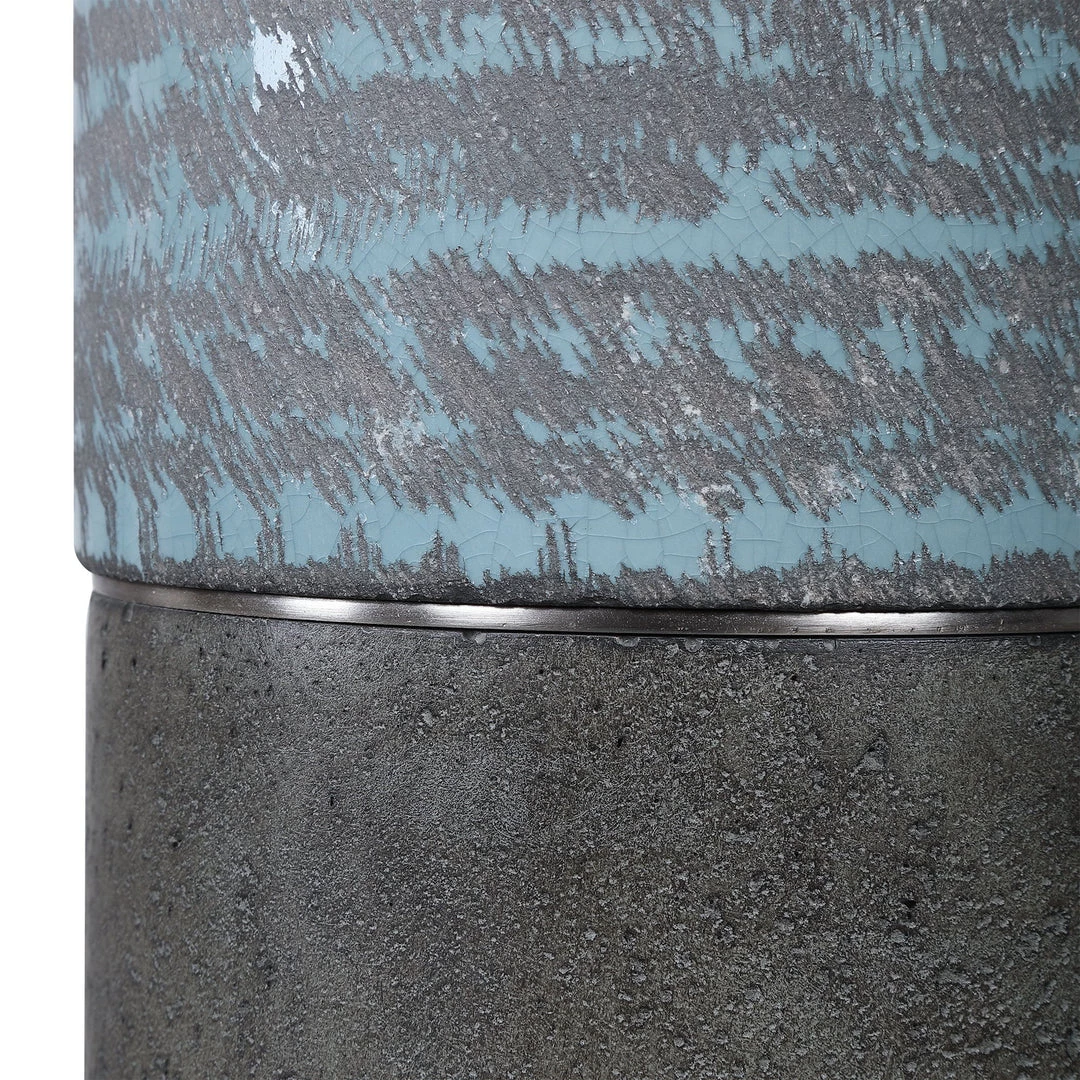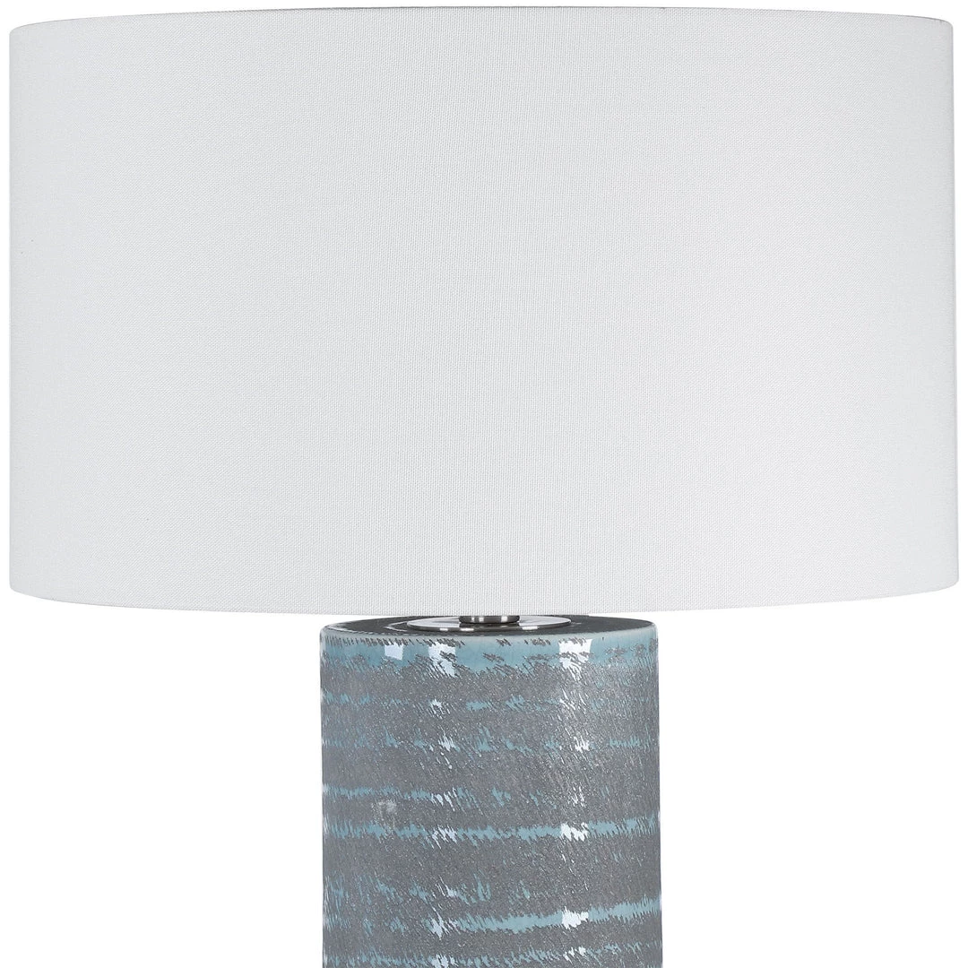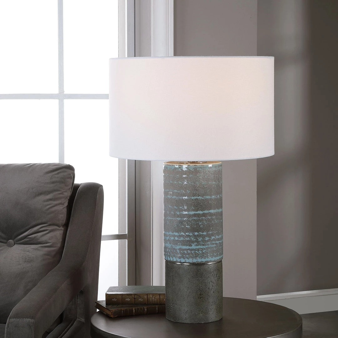 This Table Lamp Design Features A Ceramic Base With A Bohemian Flair, Finished In A Light Aqua Blue Crackle Glaze With A Scratched Gray Textured. The Bottom Portion Of The Base Has A Porous, Aged Gray Concrete Look. A White Fabric Drum Shade Completes The Look.