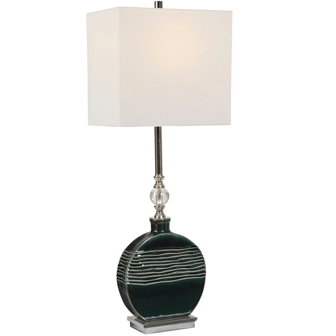 An Updated Take On Traditional Style, This Buffet Lamp Features A Dark Teal Ceramic Base With Raised Organically Shaped Ridges, Accented With Polished Nickel Plated Details And A Crystal Ornament. A Petite White Linen Fabric Square Shade Complements The Piece.