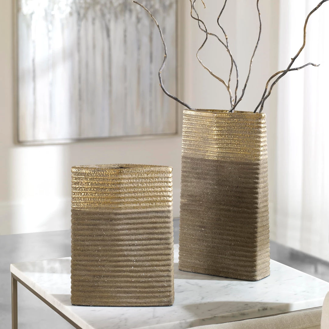 Set Of Two Vases Feature A Ribbed Design Finished In Sand Textured Earth Tones With Gold Leaf Details. Sizes: S-9x12x4, L-9x15x4