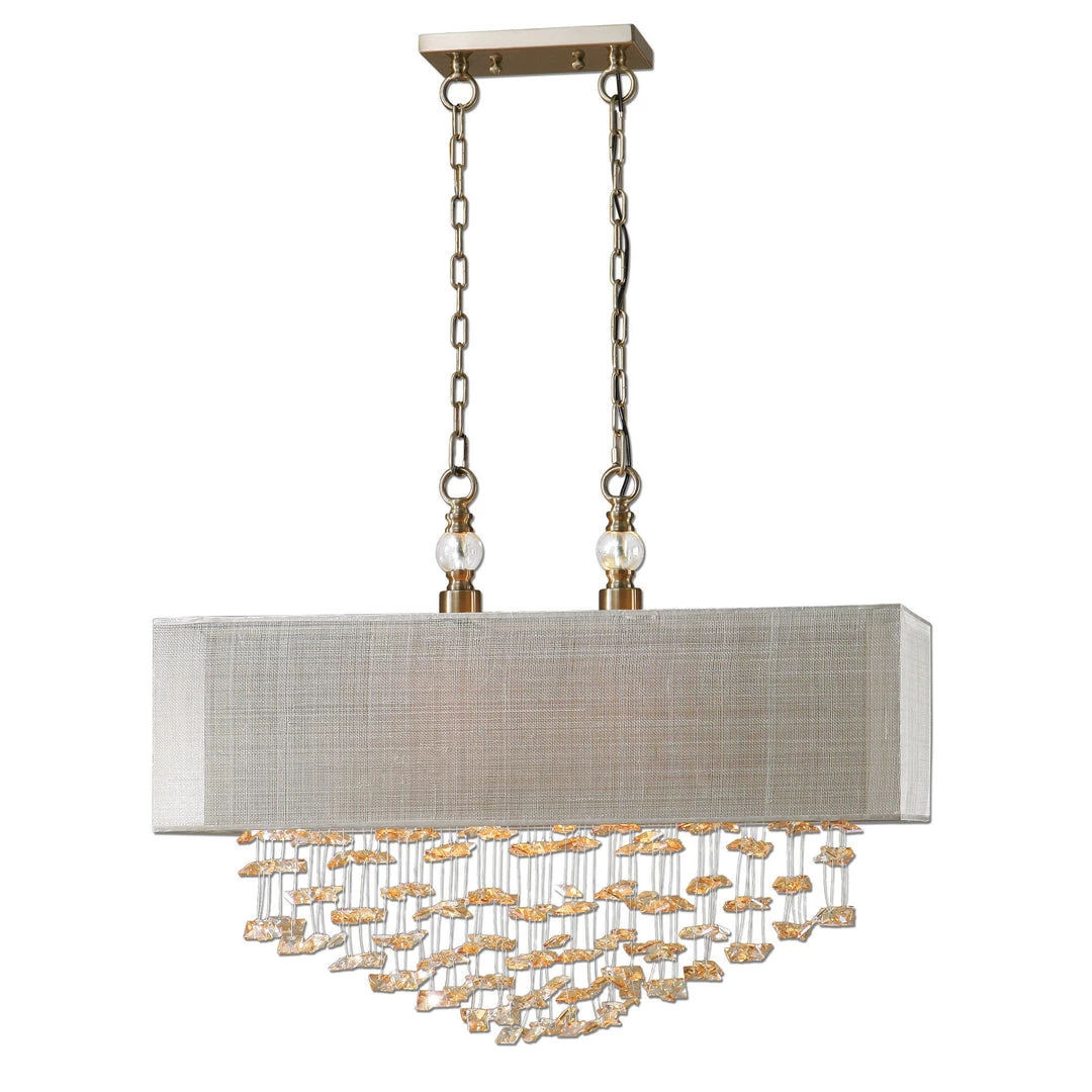 Champagne Drop Crystals Are A Brilliant Focal Point For This Sophisticated Transitional Fixture. Featuring Double Nested Shades Yielding Both Tone And Texture. Tone From The Inner Beige Fabric And Texture From Outer Open Variable Woven Thread Fabric On A Clear Hardback Support Both In Clean Rectangular Shapes. Finished With Plated Antiqued Brushed Brass. Includes 12′ Wire And 5′ Chain For Adjustable Installation.