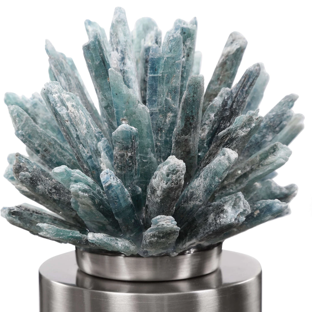 This Contemporary Set Of Two Showcase Vibrant Aqua Selenite Florets Atop Solid Iron Columns Finished In Brushed Nickel. Sizes: S-4x8x4, L-4x11x4