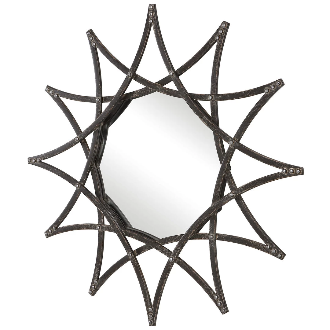 Handcrafted From Forged Iron, This Mirror Showcases A Star-shaped Frame Finished In An Aged Crackled Charcoal With A Light Gray Glaze And Antiqued Silver Rivet Like Accents.