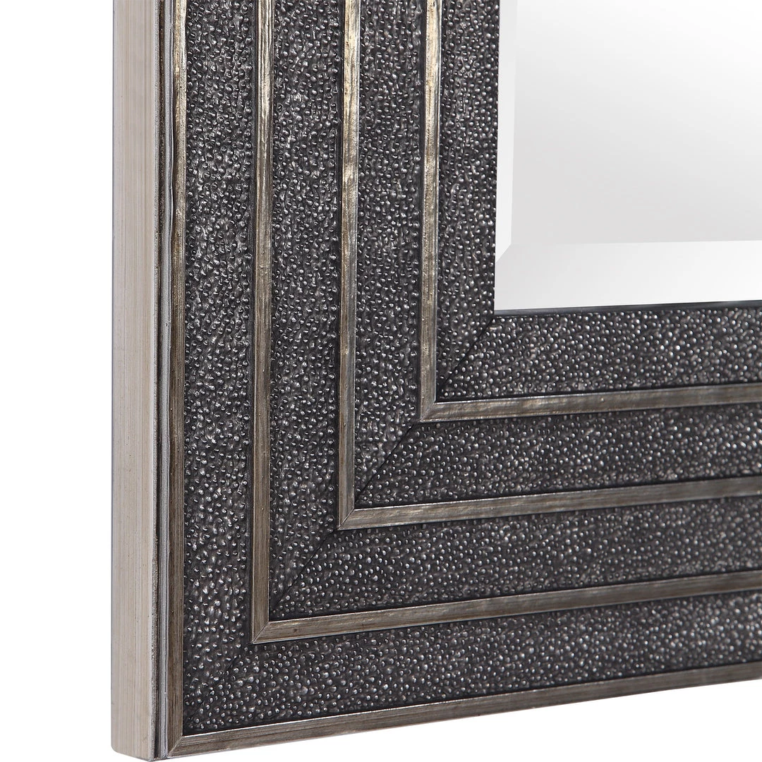 This Square Mirror Is Surrounded By A Large Aged Silver Frame With Heavy Textured Detail. Antiqued Silver Frame Accents Showcase The Visual Dimension Of This Piece. This Contemporary Design Has A 1″ Bevel.