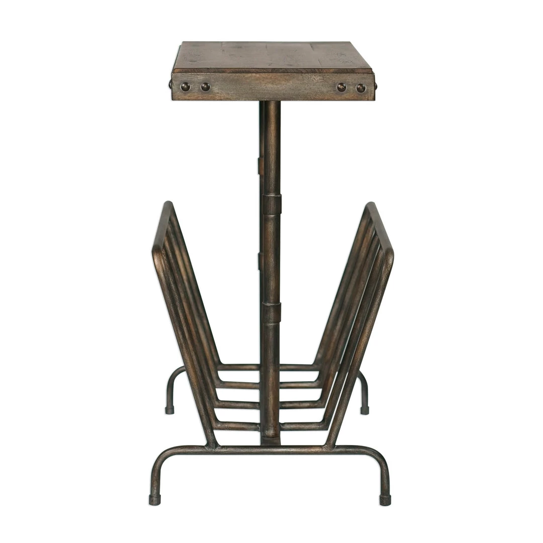 This Functional Accent Table Features A Convenient Magazine Rack With An Industrial Iron Framework Finished In A Lightly Burnished Brushed Iron With Rivet Accented Corners. Top Is Solid Acacia Wood Finished In A Distressed Warm Walnut Stain.