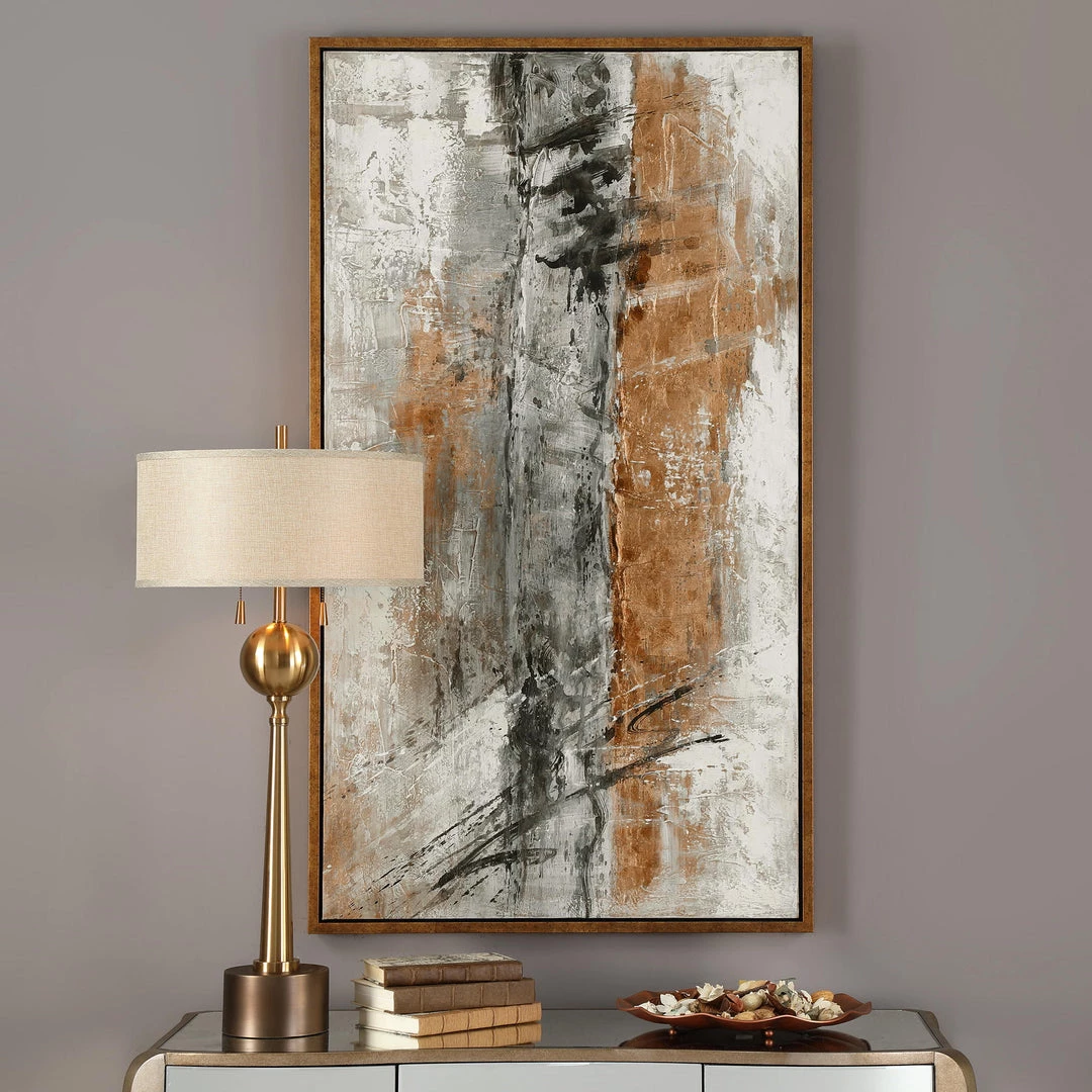 Evoking A Mid-century Modern Style, This Abstract Artwork On Canvas Showcases A Bold Design With A Subdued Palette. Large Brushstrokes Are Hand Painted In Neutral Shades Of White, Black, Bronze, And Gold. The Canvas Is Stretched And Attached To Wooden Stretchers. A Golden-bronze Gallery Frame With Mottled Brown And Black Accents Completes This Piece. Due To The Handcrafted Nature Of This Artwork, Each Piece May Have Subtle Differences. This Piece May Be Hung Horizontal Or Vertical.