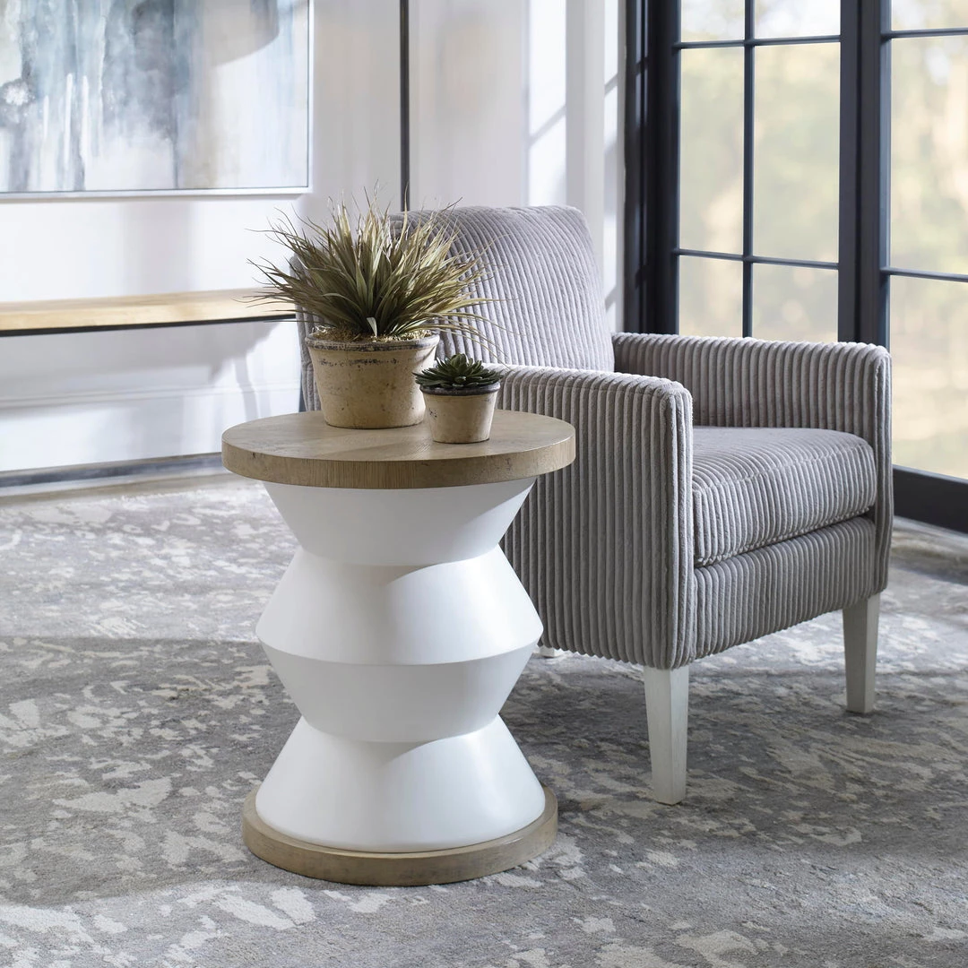 This Modern Side Table Showcases A Geometric Base Finished In Matte White. The Top Features A Light Honey Toned Stain Over An Oak Veneer Marquetry Pattern, With Burl Accents.